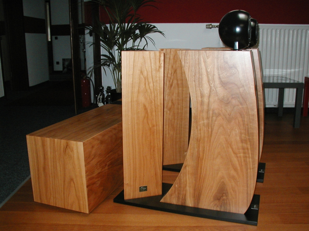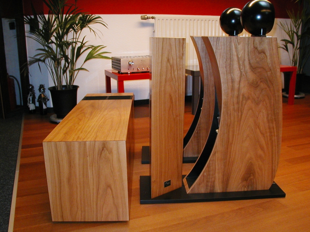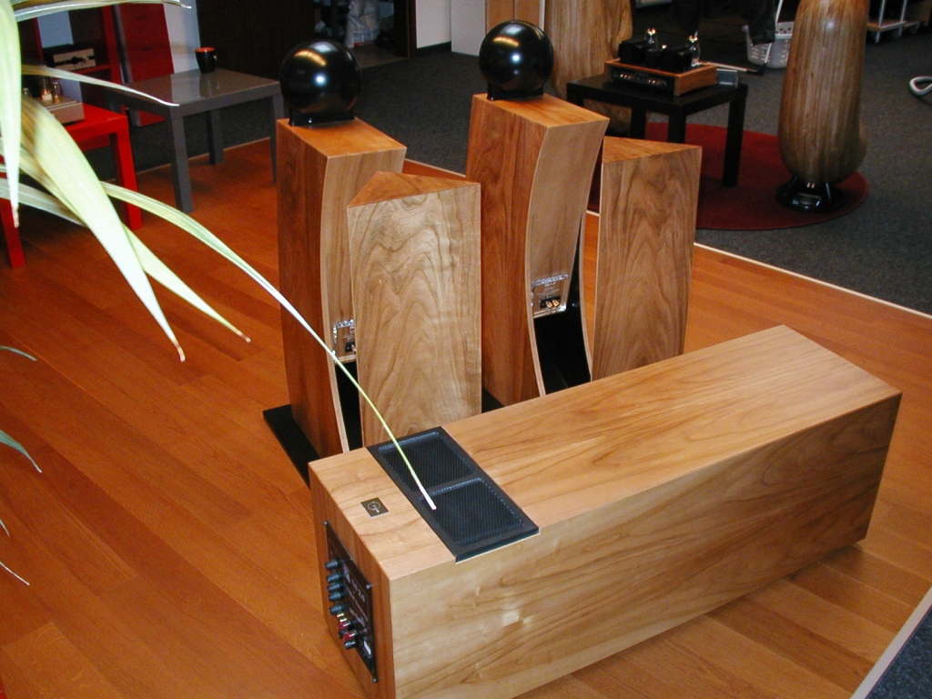 Fostex 4" Breitbandchassis rein akustisch gefiltert im spärischen Gehäuse (minimiert Kantenreflexionen). Der Hornmund strahlt nach Hinten auf einen Deflektor zur Vergrößerung der wirksamen Hornmundfläche. Auch optisch ist dieser Lautsprecher absolut eigenständig.