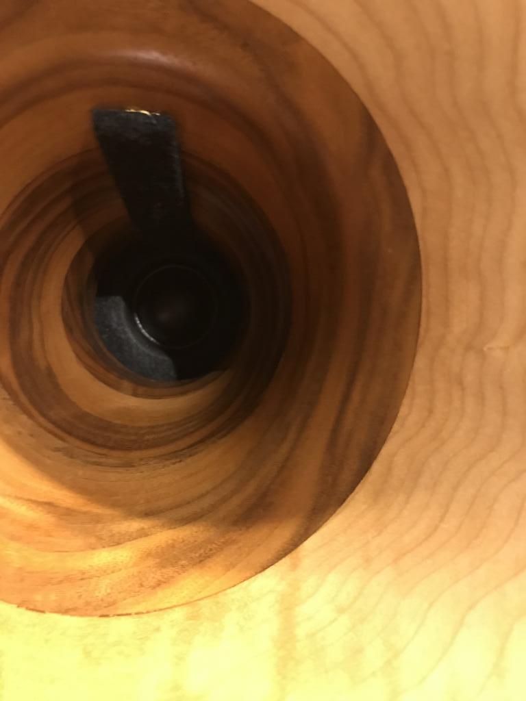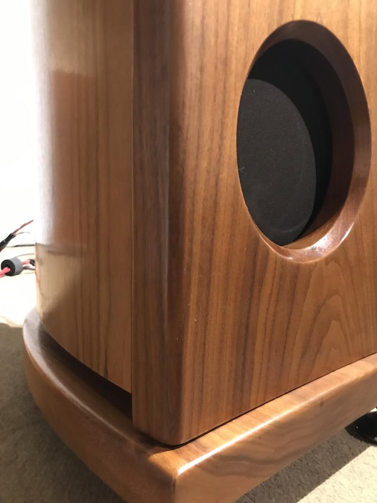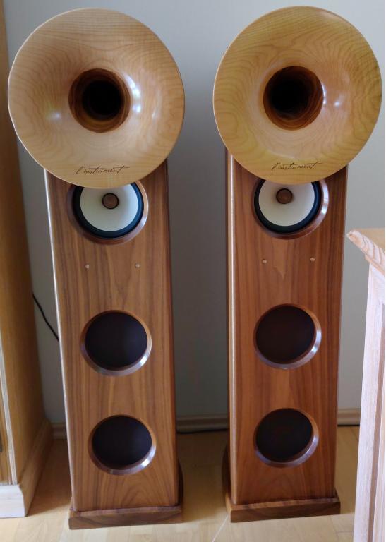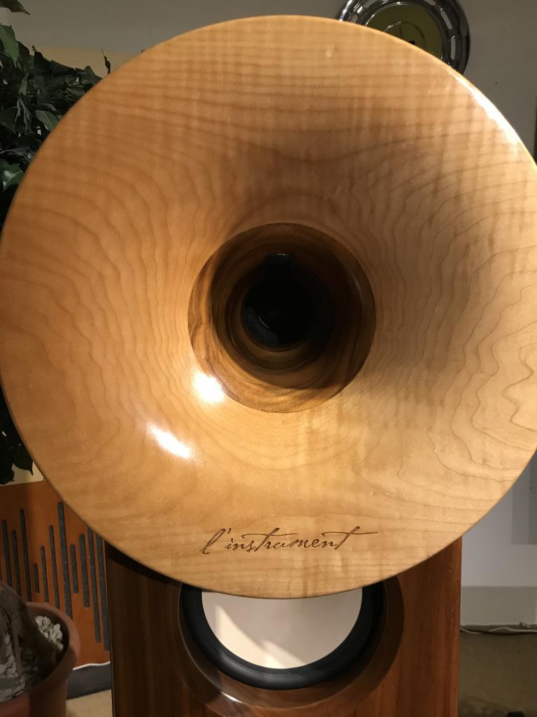 Ein Hornlausprecher mit einem anderem sehr besonderen Konzept, anstatt das Horn direkt mit einem Chassis zu verbinden, gibt es einen Spalt, wodurch dann sämtliche Chassis spielen (atmen). Das Gehäuse ist ansonsten geschlossen. Es gibt keinerlei Kunststoff in und am Lautsprecher, sondern nur Massivholz. Dadurch daß kein Dämmmaterial verwendet wird, ist der Wirkungsgrad sehr hoch und kann deshalb auch sehr gut mit Röhren kleiner Leistung betrieben werden, z.B. 300B. Intern ist ein Resonator (Klangholz) verbaut, das mitschwingt und so Instrumente noch natürlicher erscheinen läßt. Er spielt sehr luftig und dreidimensional. Ist total unproblematisch aufzustellen und spielt auch in kleineren Räumen ab 20 qm. Die Verarbeitung ist nahezu perfekt.