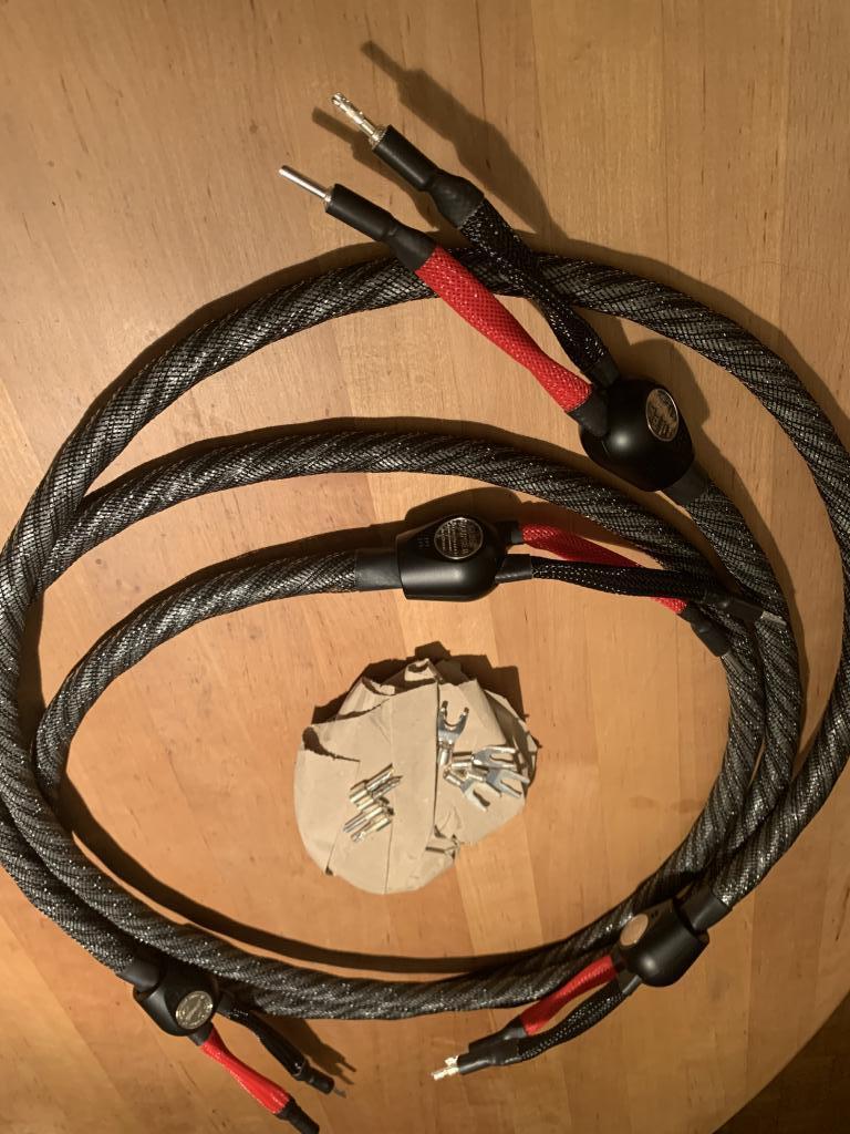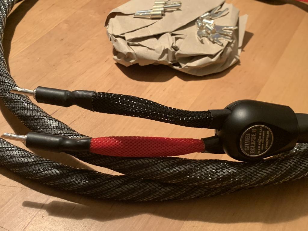 Leider muss ich meine 2 Meter langen WW Silver Eclipse 8 LS-Kabel abgeben, da sie für meinen neu erworbenen Kompaktlautsprecher nun leider etwas zu kurz sind. Ich habe sie im letzten Jahr als Aussteller beim einem deutschen Händler gekauft (Rechnung vorhanden) und habe vor kurzem ein komplettes Set (8 Stück) neue, schraubbare „Uni-term“ WireWorld-Bananenstecker mit den bislang angebrachten Anschlüssen ausgetauscht (diese werden aber ebenfalls mitgeliefert).