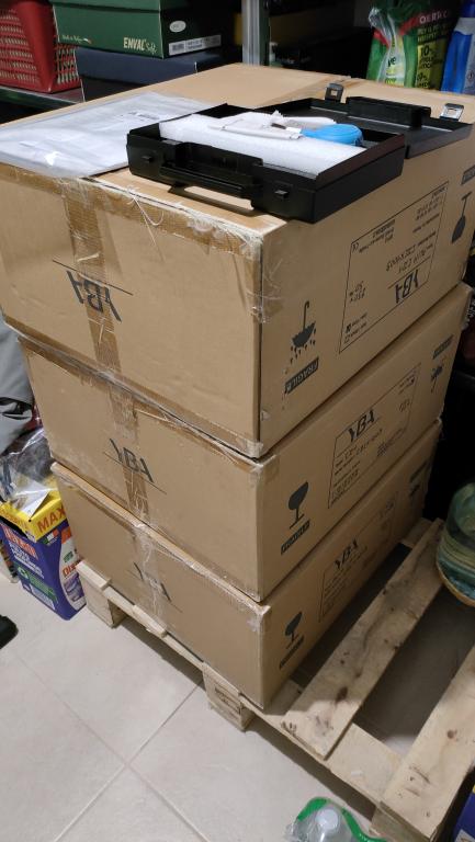 It comes with triple box original packaging, and all the accessories (remote control, power cords, manual).