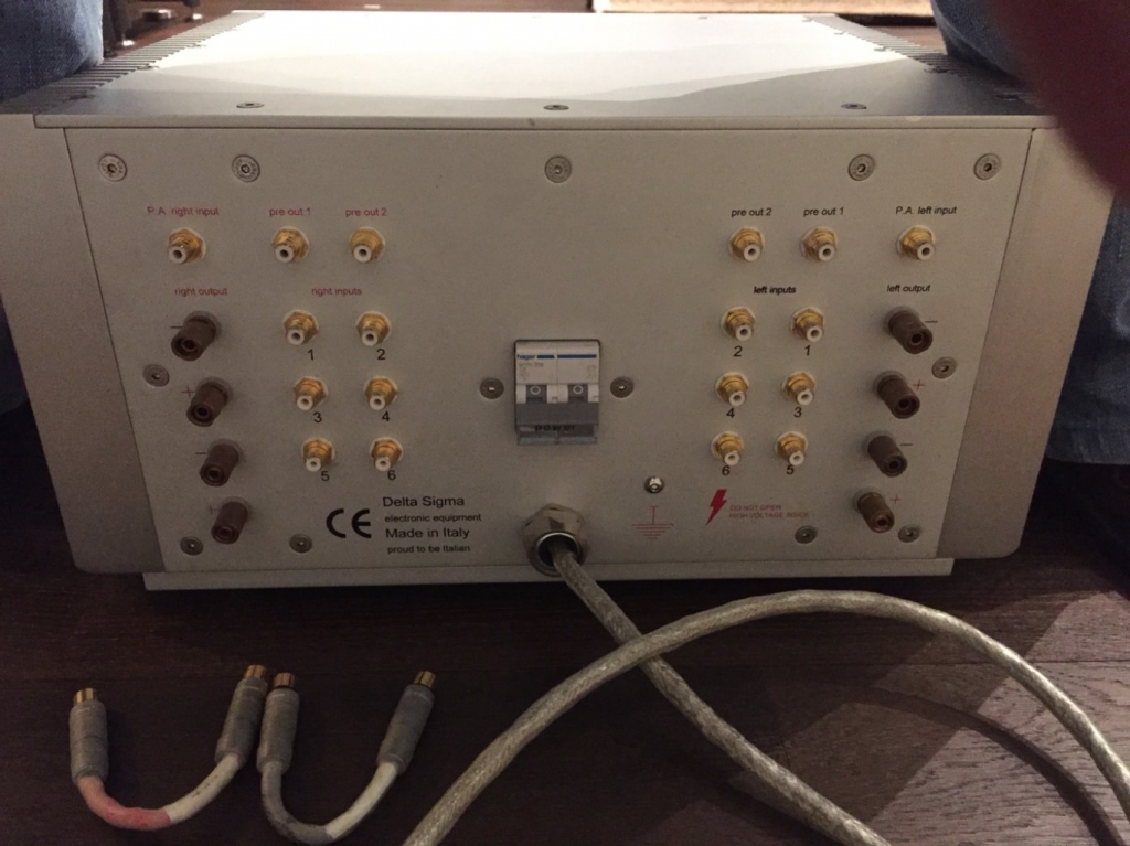Weltweit bekannter Delta Sigma Integrated Amplifier. Basierend auf fortschrittlicher 3-MHz-Schaltung, mit spektakulärem Klang - transparent rein, ultrahohe Auflösung, uneingeschränkte Dynamik und eine Präsentation, die den wahren Klang einer Stimme, eines Klaviers oder eines Musikinstruments einfängt. Klanglich repräsentiert es die transparente Reinheit der besten OTL-Verstärker, aber blitzschnell mit einer größeren Erweiterung des oberen Endes, einem offeneren Klang, tieferen und strafferen unteren Oktaven, einer müheloseren explosiven Dynamik und einer erstaunlichen lebensechten Darstellung.Spezifikationen• Frequenzgang: 3-3MHz (± 1db)• Ausgang: 150 W / Kanal bei 8 Ω 300 bei 4 Ω 600 bei 2 Ω• Spitzenleistungsabgabe: 2.000 W / Kanal bei 8 Ω• Vorverstärkerausgang: 5V• Verstärkerausgang: 50V• Dual-Mono + Design• Separate Linestage- und Verstärkerkarten für jeden Kanal• Separate Stromversorgung für jede Karte (insgesamt 4)-English-Worldwide known Delta Sigma’s Integrated Amplifier. Based on advanced 3MHz circuit, with spectacular sound – transparently pure, ultra high resolution, unrestrained dynamics and a presentation that captures the true sound of a voice, piano or any musical instrument. Sonically, it represents transparent purity of the finest OTL amplifiers but lightning fast with a greater top end extension, a more open sound, deeper & tighter bottom octaves, more effortlessly explosive dynamics and an amazing lifelike presentation.Specifications •Frequency Response: 3-3Mhz (±1db)•Output: 150w/ch@8Ω 300@4Ω 600@2Ω•Peak Power Output: 2,000w/ch@8Ω •Preamp output: 5V•Amplifier output: 50V•Dual-Mono+ design•Separate linestage & amplifier boards for EACH channel•Separate Power Supply for each board (4 total)pictures: https://flic.kr/s/aHsmfqt1x7