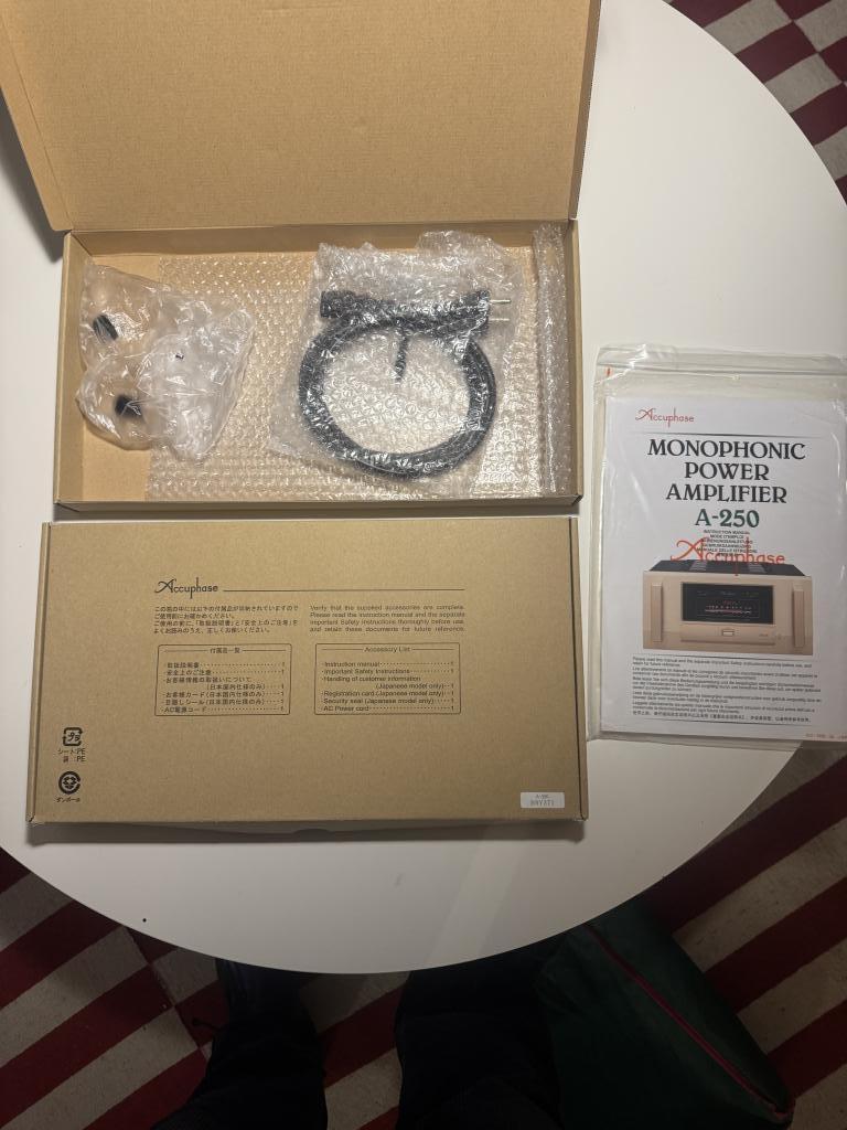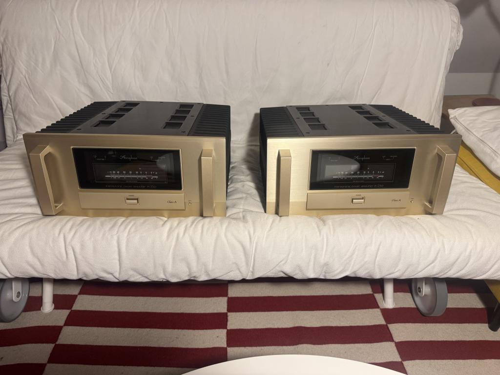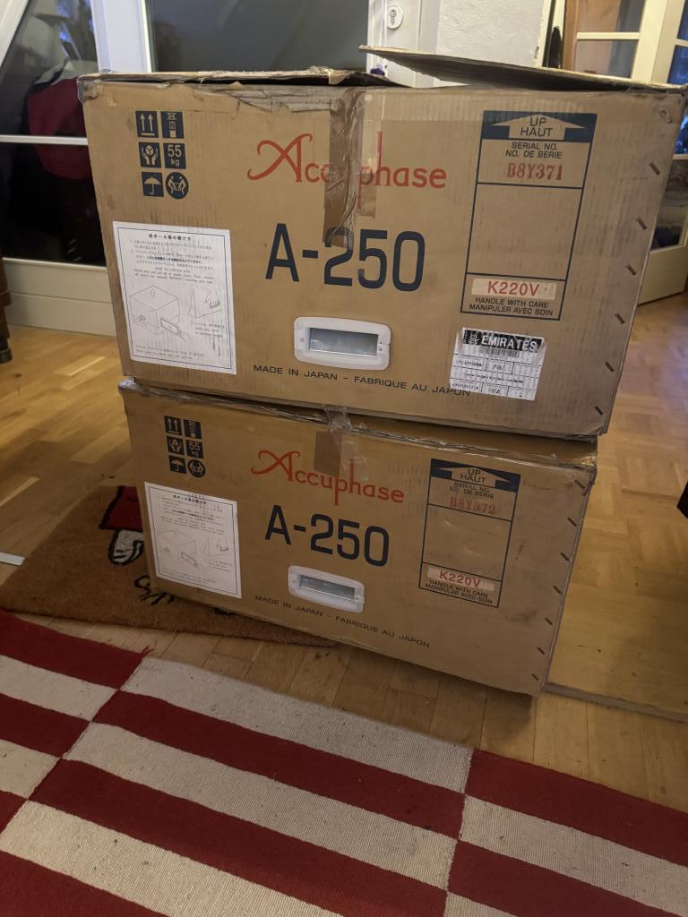Ich biete auch mein paar A 250 von accuphase an. Es handelt sich nicht um PIA Geräte, sondern ich habe sie aus Hongkong importiert. Dort besteht die gleiche Stromspannung wie bei uns. Die monos sind im gepflegten Neuzustand ohne jegliche Mängel mit dem kompletten originalzubehör.