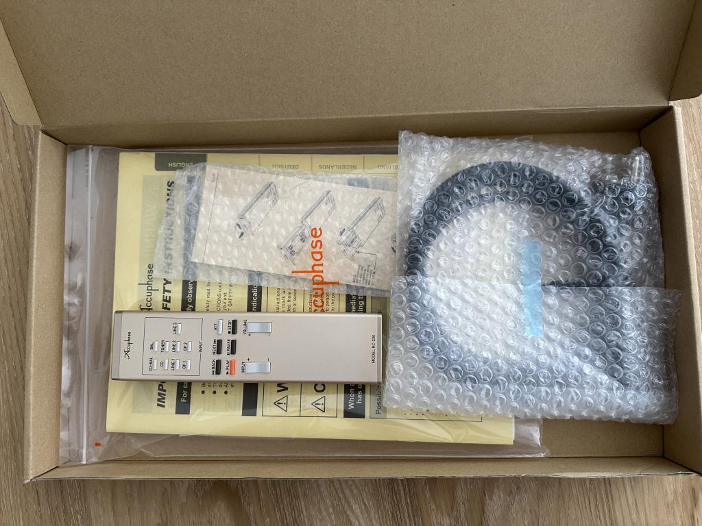 Originalkarton, Stoffhülle, Fernbedienung, Netzanschlusskabel und Beschreibung.