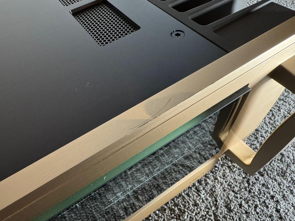 Das Gerät hat auf der Oberseite der Frontplatte einen Kratzer, sowie einen weiteren kleinen Kratzer auf dem Deckel.