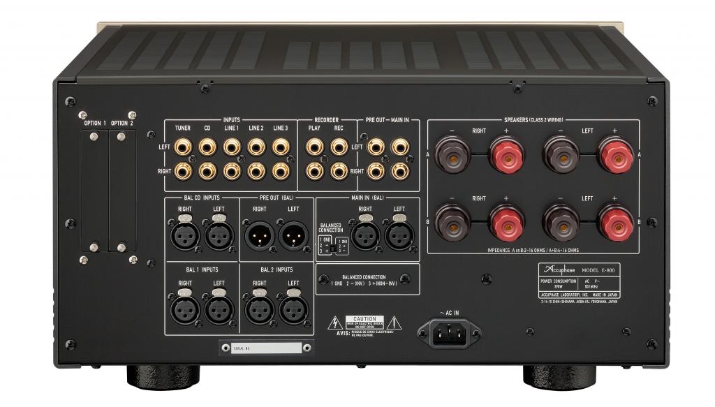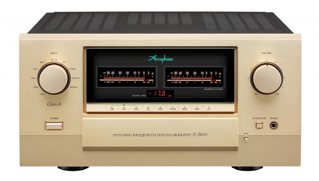 Im Vorverstärkerteil des E-800 kommt die erneut verbesserte „Balanced AAVA“- Lautstärkeregelung zum Einsatz. Die Lautstärkeregelung erfolgt feinfühlig über einen von Accuphase entwickelten Sensor-mechanismus, der aus einem einzigen massiven Aluminiumblock gefräst wurde. Die mächtigen, mit MOS-FET Leistungstransistoren bestückten Class-A Endstufen, können mit einer Ausgangsleistung von satten 2 x 50 Watt an 8 Ohm im "Claas A" - Betriebsmodus aufwarten. Die maximale Dauertonleistung an 8 Ohm liegt mit 2 x 85 Watt (respektive 2 x 200 Watt Impulsleistung) allerdings nochmals deutlich darüber. Zur optimalen Betriebssicherheit sind die Endstufenmodule auf hoch effiziente Kühlkörper montiert.
