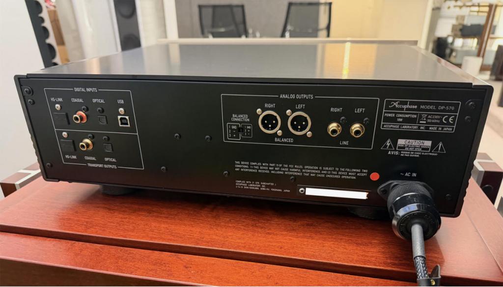 Das großzügig dimensionierte Netzteil mit seinen neu entwickeltem Netztransformator versorgt das Analogteil und das Digitalteil des Geräts separat. Die getrennte Auslegung von Transport- und Prozessorteil, mit einer Vielzahl an Ein und Ausgängen ist selbstverständlich. Der USB-Anschluss unterstützt Abtastfrequenzen bis zu 384 kHz/32-Bit und 11,2896 MHz/1-Bit DSD. Für die digitale Raumeinmessung mit dem Accuphase DG-68 ist die HS-Link2 Schnittstelle mit Ein und Ausgänge vorgesehen.