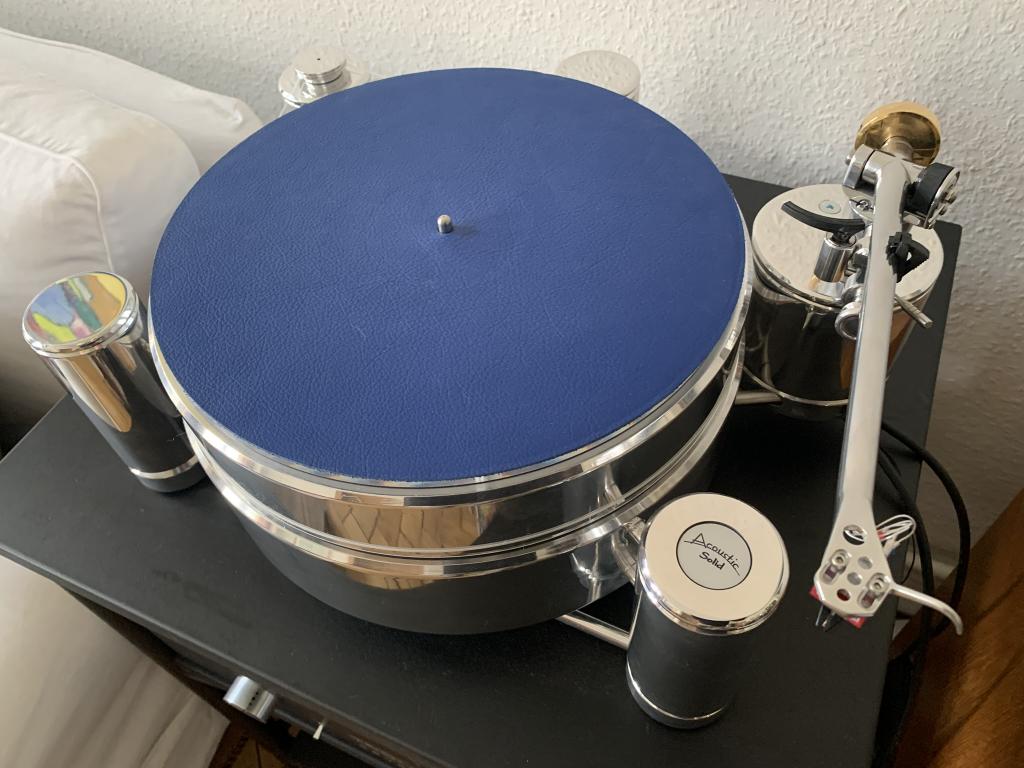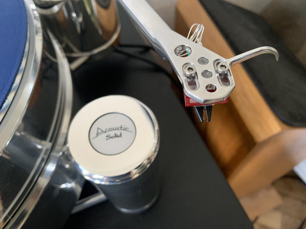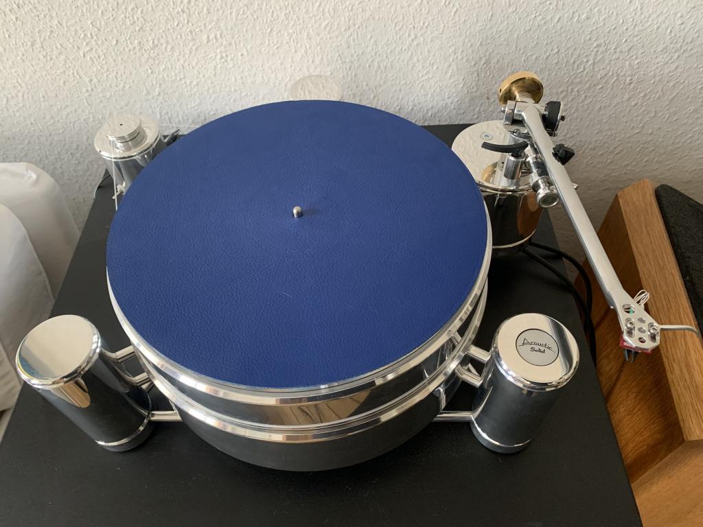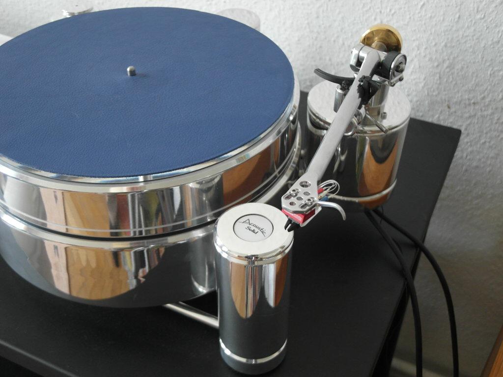 Hervorragendes Masselaufwerk in klanglich und optisch wunderschöner Ausstattung mit Chrom-Spezialversion des Rega RB 300 Tonarms und Soundsmith Otello Tonabnehmer. Sehr gepflegter Zustand mit exzellentem, problemfreiem Lager. Inkl. originaler Bedienungsanleitung und Originalverpackung. Karl Wirth mit seiner schwäbischen Firma Acoustic Solid hat mit diesem Laufwerk seinen Erfolg begründet. Auf Grund seiner Masseverhältnisse sowie der weichen Aluminiumlegierung mit hohem Bleianteil zeigt der Solid One ein hervorragendes Resonanzverhalten. Seine einmalige Abtastruhe sorgt für ein überragendes Klangbild. Der rega-Arm ist ein hochwertig überarbeitetes Modell mit mechanischen Feinarbeiten und eine neuen Verkabelung. Innen wurde teflonisoliertes 99,999+ % Silberlitzenkabel verwendet. Der Erdungsdraht ist nicht mit dem linken Minuspol verbunden, was bei Rega-Armen Standard ist, sondern Extern ist ein Mogami-Kabel mit WBT-Verriegelungssteckern. Alle Lötstellen wurden mit WBT-Silberlot hergestellt. Der Tonabnehmer Soundsmith Otello (NP 800€) ist ein amerikanisches Moving Iron System und erst wenig gelaufen. Sein warmer, kräftiger Klang in Kombination mit hoher Detailauflösung und einer enormen Dynamik ermöglicht stundenlangen Musikgenuss mit jeder Art von Musik.