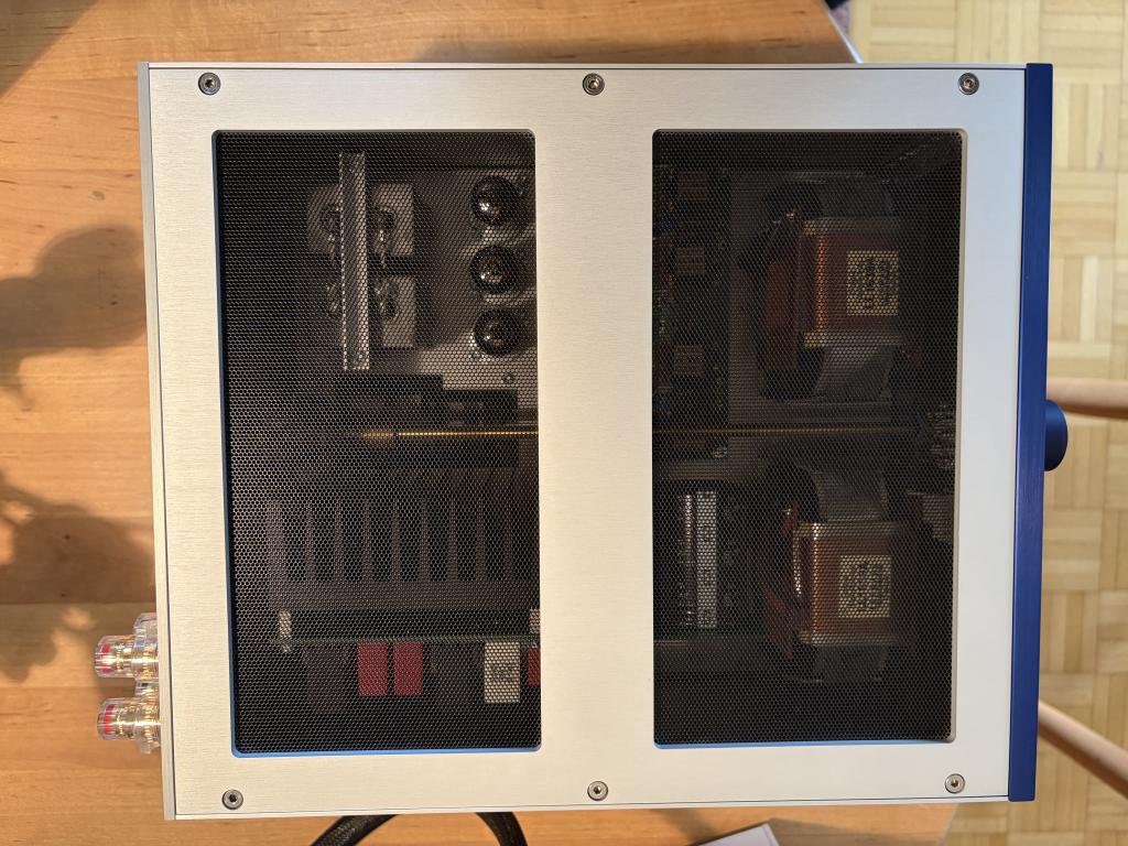Das von den Vorstufenröhren verstärkte Signal geht dann direkt in eine aus diversen Übertragern und anderen Bauteilen aufgebauten „Verstärker“ und dann zu den Lautsprecherklemmen. Es gibt also keine Transistoren oder Endröhren im Leistungsbereich des Verstärkers. Stabile 15 Watt Ausgangsleistung in Class A, jedoch sollten die Lautsprecher keine Impedanzmonster (mit weniger als 4 Ohm) sein. Das Netzteil des MagAmp ist in einem separaten Gehäuse untergebracht von mir mit einer ultimativen Feinsicherung beim Netzeingang versehen worden.Die Eingangsempfindlichkeit kann mit 2 kleinen Potis ebenfalls angepasst werden und es sind für 4 Hochpegelquellen entsprechende Cinch-Eingänge vorhanden, sowie eine puristische Fernbedienung im Design des MagAmp für die Lautstärke.