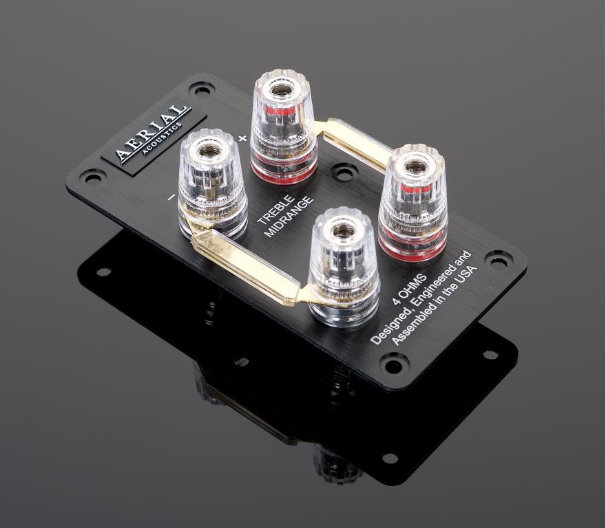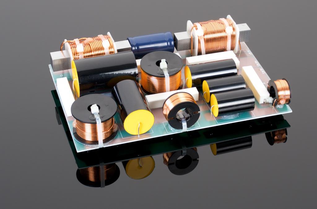 Fourth order acoustic Linkwitz-Riley at 600 Hz and 4kHz crossover frequencies, 2 physically separate networks on glass-epoxy PCBs, bi-wirable and biampable, high-purity copper wiring and silver solder, premium passive components