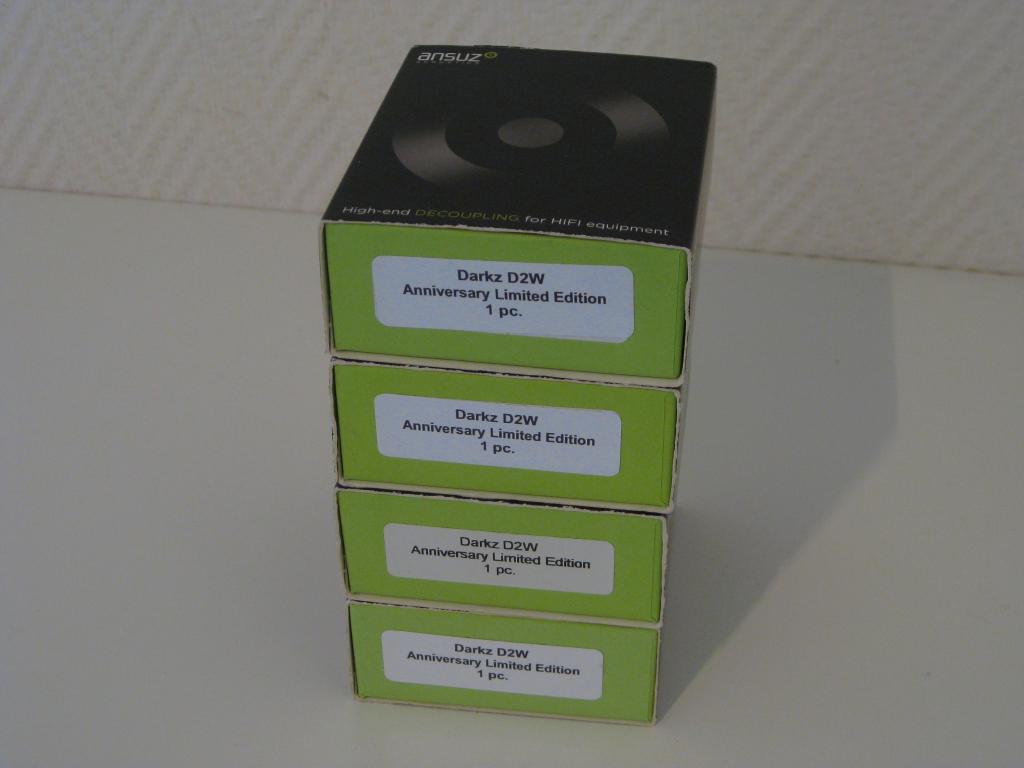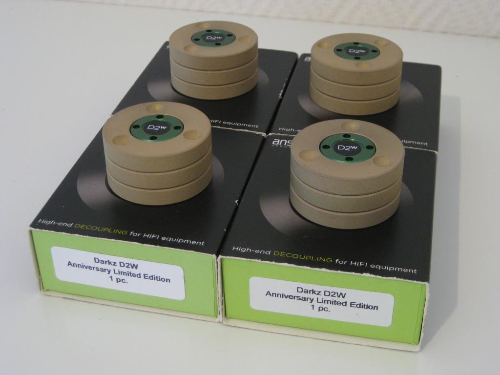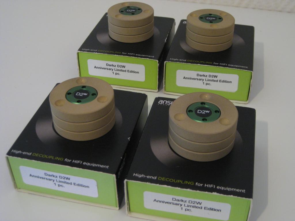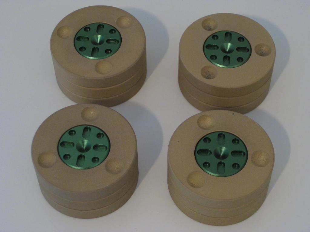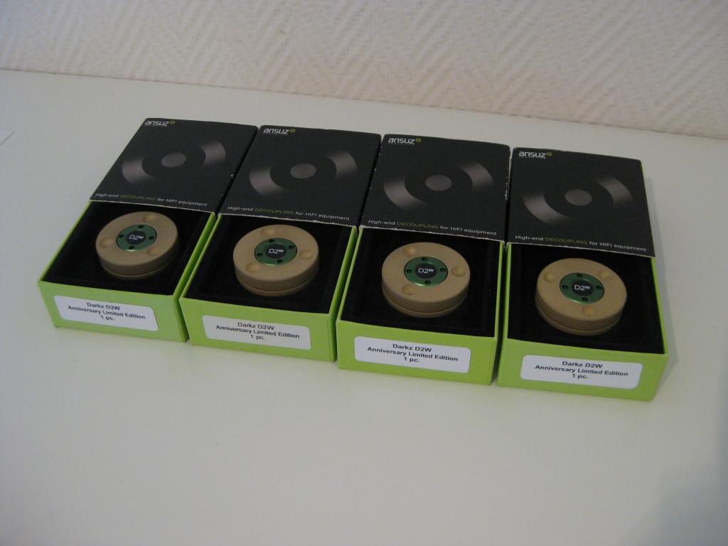 Angeboten wird ein 4er Set Entkopplerfüße der dänischen Firma Ansuz. Es handelt sich um die Sonder-Edition zum 10 Geburtstag der Firma. Hier wurden einige Techniken der höchsten Serie (Z2w) übernommen, zu einem günstigeren Preis. Der UVP lag bei 800 Euro je Stück.