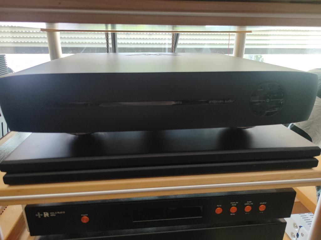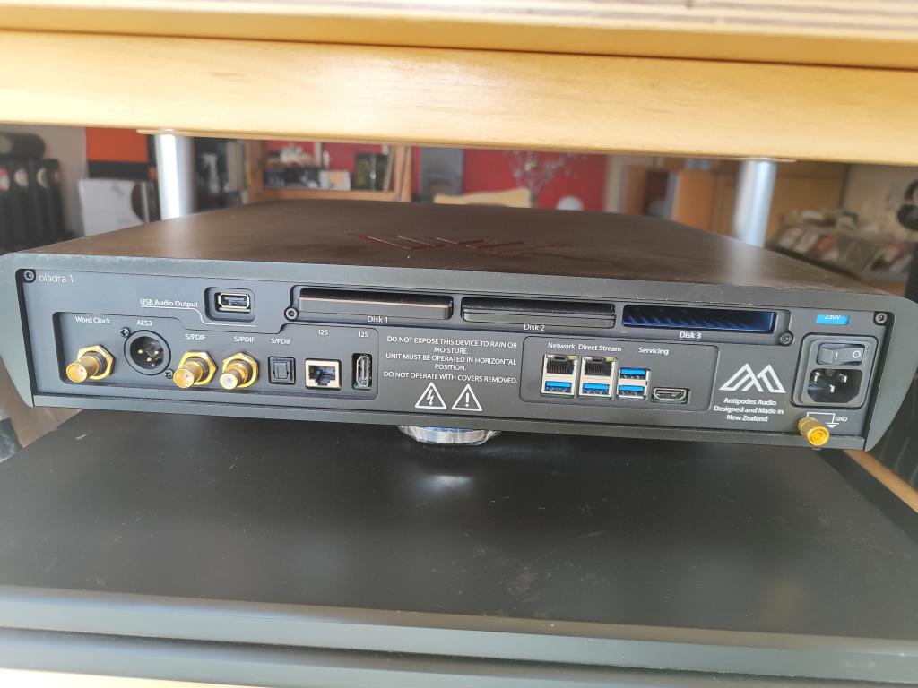 Der Antipodes Oladra G4 ist einer der weltweit wenigen allerbesten Musikserver und Musikplayer. Er besitzt zwei Computereinheiten für die separate Funktion als Server und Player. Drei Slots für SSDs mit je bis zu acht Terabyte. Die auf dem Foto abgebildeten SSDs gehört nicht zum Lieferumfang. Man kann aber darüber reden. Mein Oladra wurde im Januar 24, ein Jahr nach Erwerb, auf den G4 in Neuseeland umgerüstet. Seit dem läuft die Garantie wie bei einem Neugerät, die er ja auch dadurch praktisch ist. Wie man auf dem Foto sieht, haben die Standfüße noch die Schutzfolie. Was außer dem Oladra G4 auf den Fotos zu sehen ist, ist nicht Bestandteil des Angebots. Ich bitte, die Qualität der Aufnahmen zu entschuldigen, aber ich wollte den Antipodes nicht aus dem Rack nehmen, denn er hat ein ordentliches Gewicht.