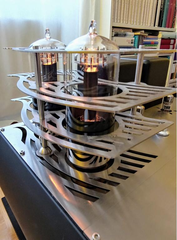 The device is offered with all accessories: remote control, hardback operating instructions, original tubes, original solid wood case, etc. - The offer also includes two pairs of unused (NOS) Siemens E280F 7722 pre-tubes. The installed Elrog ER-845 power tubes are still in production and therefore easily available, just in case. However, as the 845 power tubes in the Genus are only moderately loaded due to the design, they should easily achieve a service life of approx. 3000 hours or more.