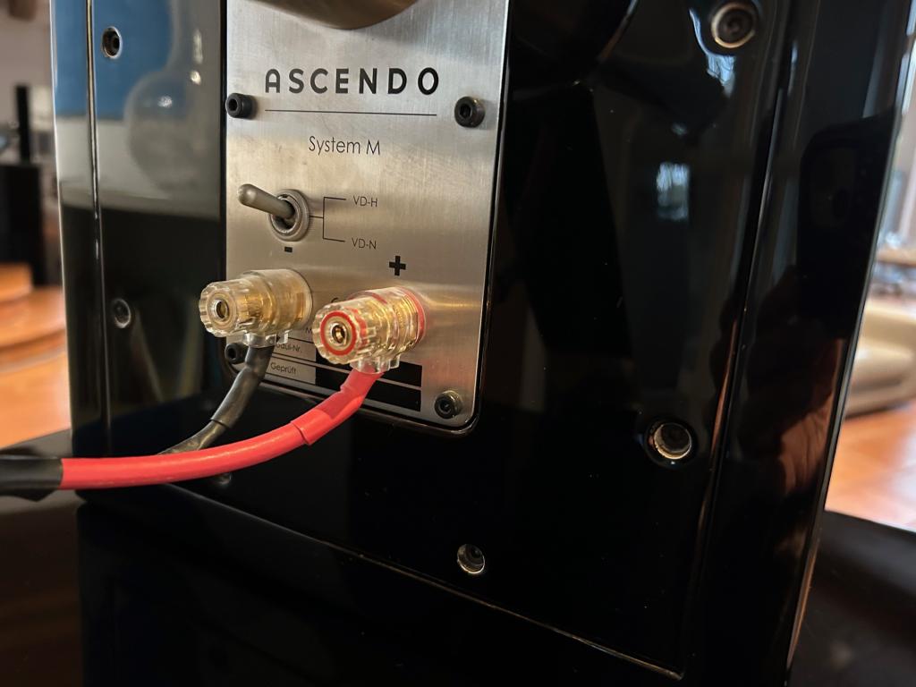 Der Ascendo System M Lautsprecher hat einen angegebenen Frequenzgang von 26Hz-35kHz (-3dB). Empfindlichkeit wird angegeben bei 88dB (2,83 V/1m). Die Nennimpedanz wird als 8 Ohm angegeben, mit einer Mindestimpedanz von 4,5 Ohm bei 105Hz. Maximal empfohlene Leistung ist 600W Programm, 1000W Spitze.