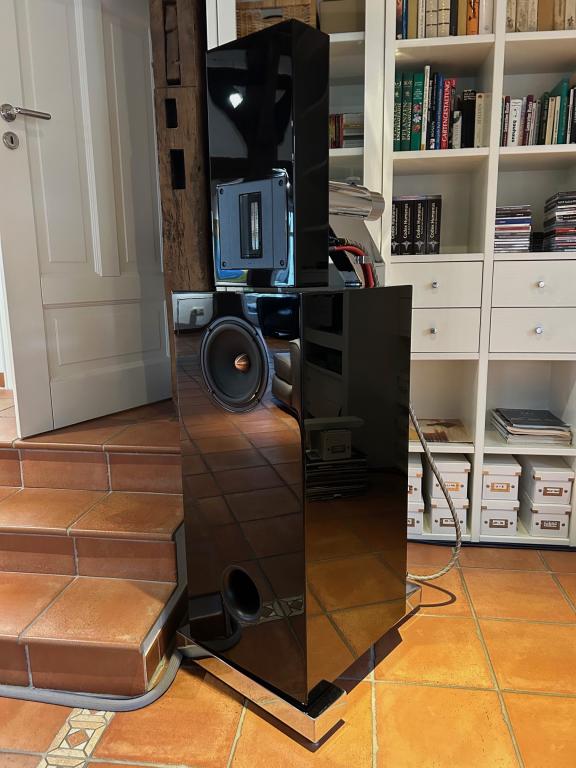 Komplexe dreiteilige Drei-Wege-Lautsprecher mit einstellbarem Hochtönerabschnitt, der eine präzise Zeitausrichtung ermöglicht. Maße: Lautsprecher+Ständer: ca. 40 / 156,0 / 60cm. Gewicht: ca. 96 kg.