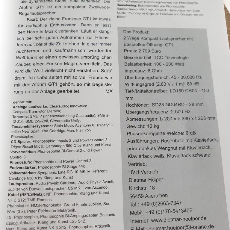 "Der kleine Franzose GT1 ist etwas für audiophile Enthusiasten. Denn er lässt den Hörer in Musik versinken. Läuft er klanglich bei sehr guten Aufnahmen zur Höchstform auf, bleibt die Zeit stehen. In einer immer nüchterner und kaufmännisch werdender Welt kann er einen gewissen ursprünglichen Zauber, einen Funken Magie, vermitteln. Das wird die Welt vielleicht nicht verstehen. Sei‘s’ drum. Ich habe selten mit so viel Freude wie mit den Atohm GT1 gehört, so mit Begeisterung an der Anlage gearbeitet."