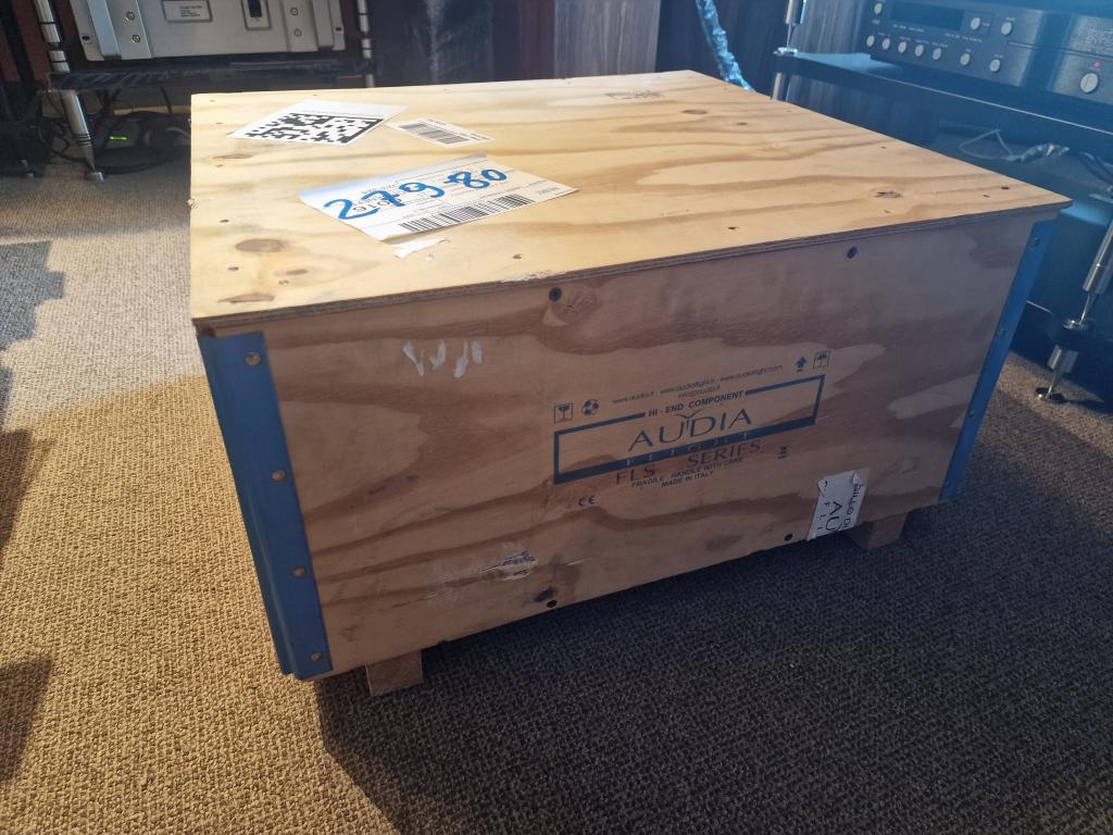Der Vollverstärker ist in einer großen Holzkiste verpackt (Originalverpackung),