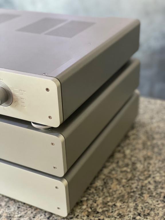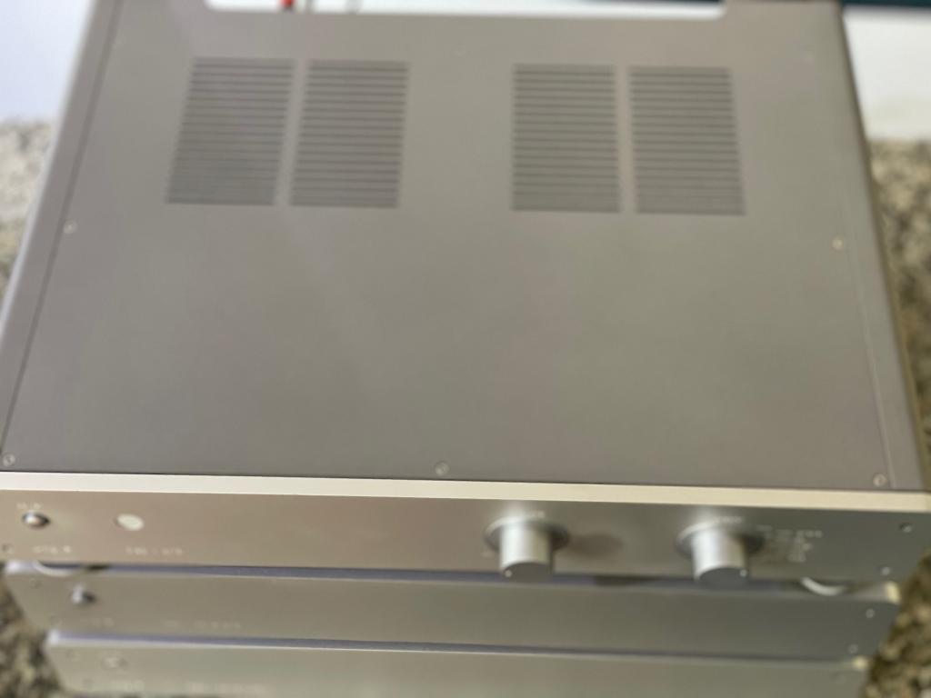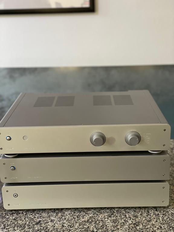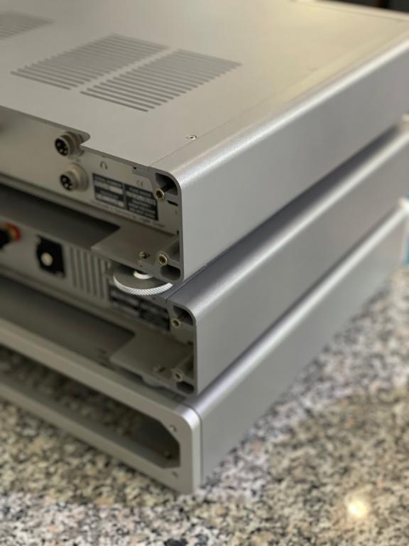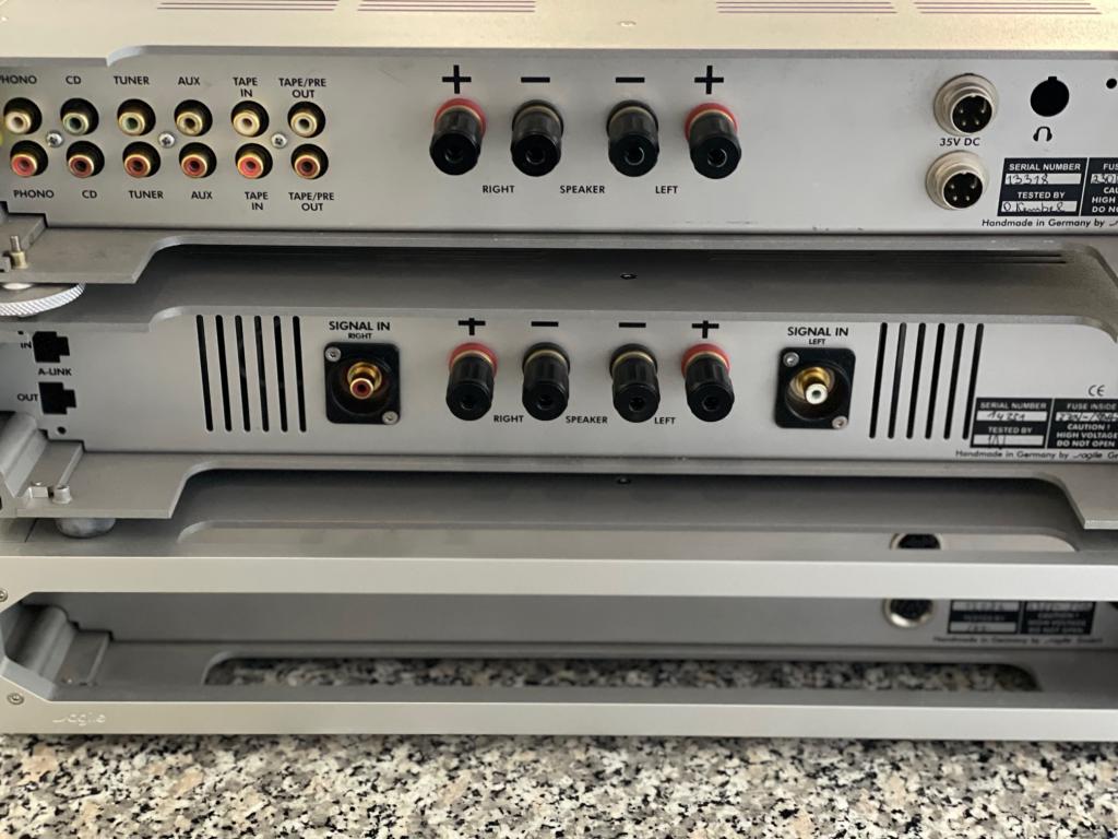 vergoldeten Cinchbuchsen. Aufwendiges Netzteil mit zwei 80W - Ringkerntrafos und 8x10.000μF Elkos; eingebautes Phono MM- Modul.
