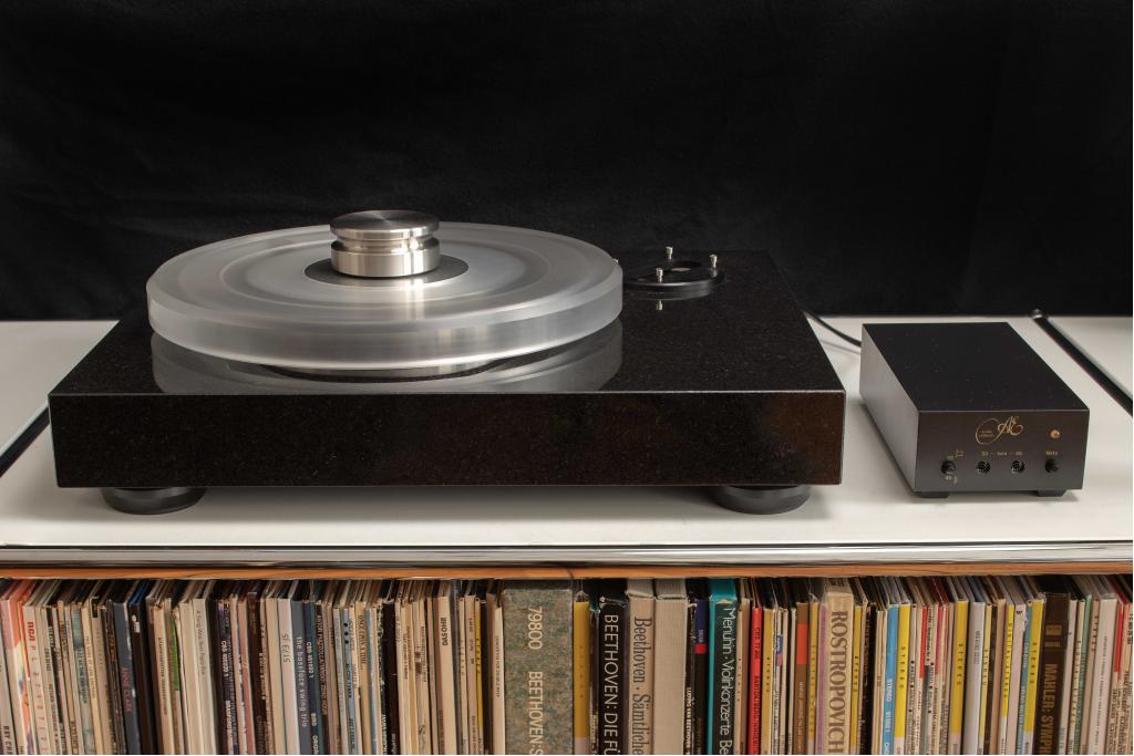 Laufwerk mit Netzteil und SME Tonarmbasis und Plattengewicht.