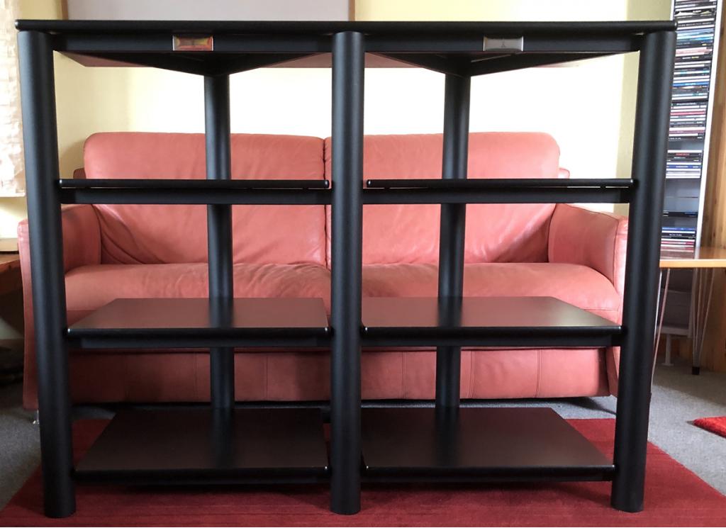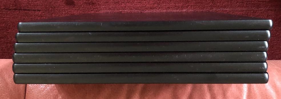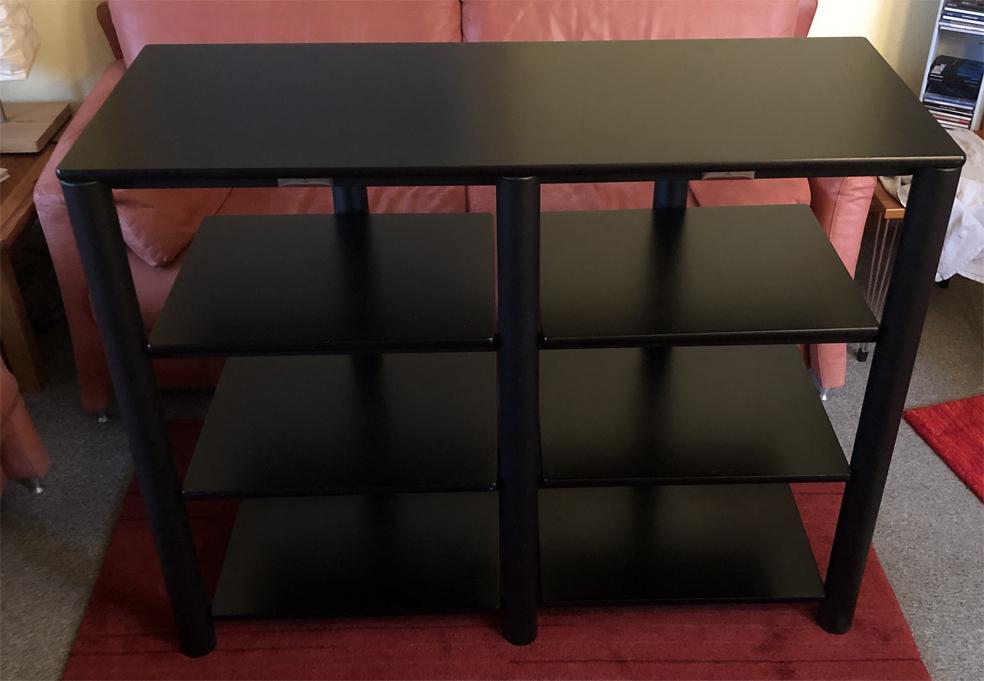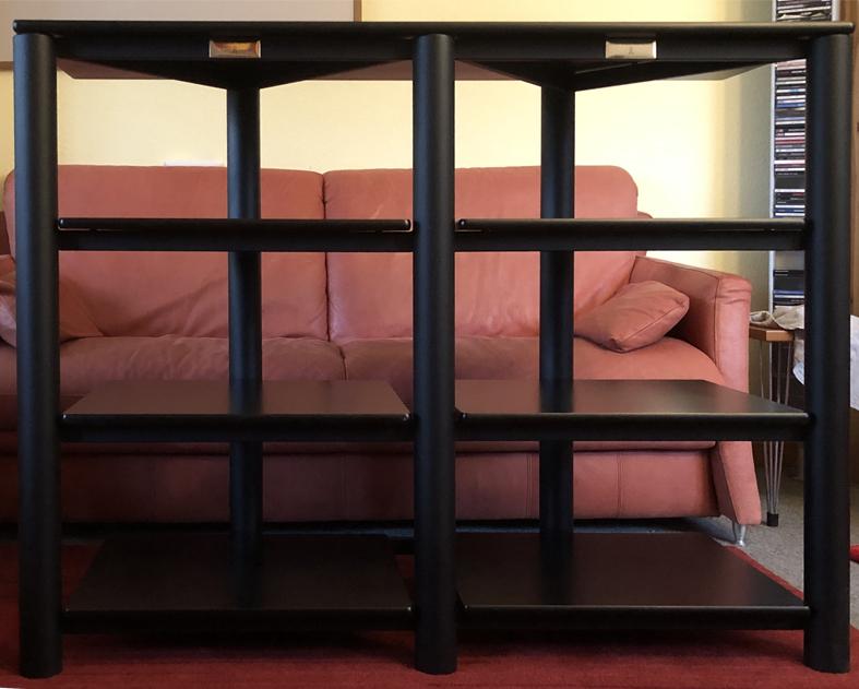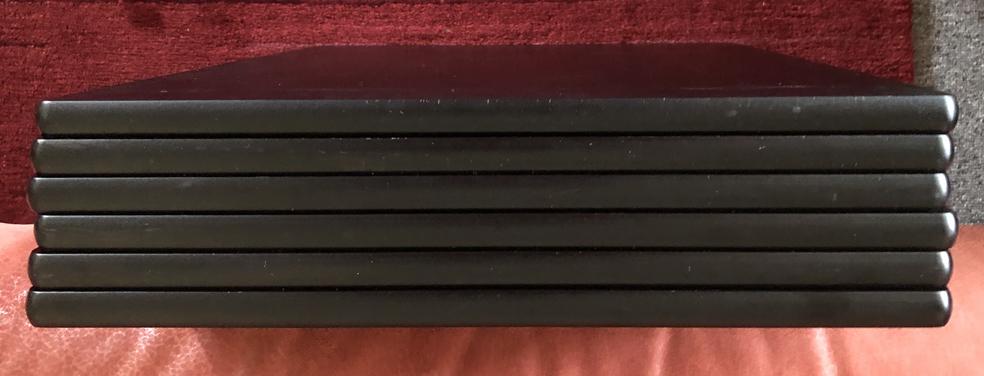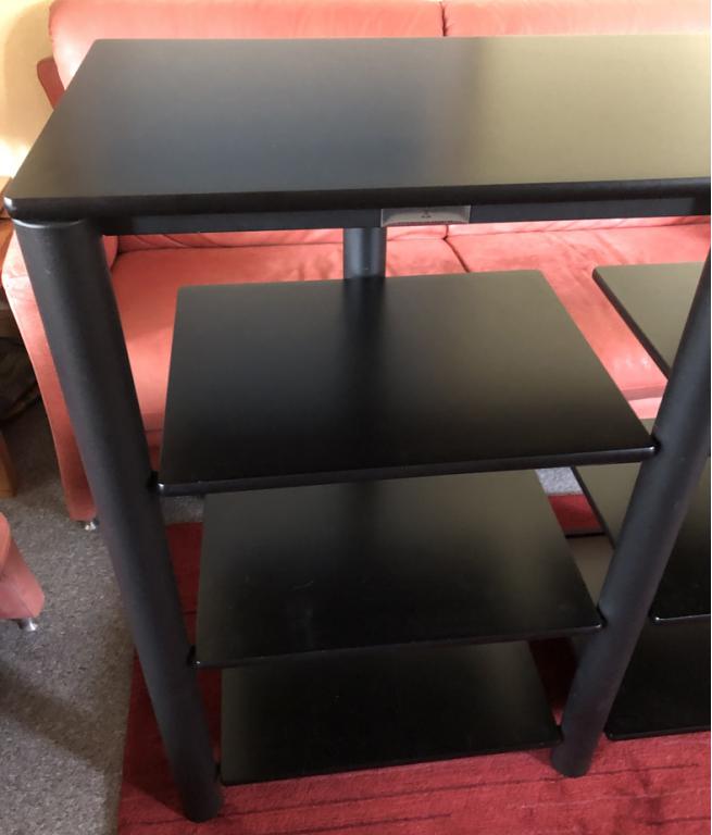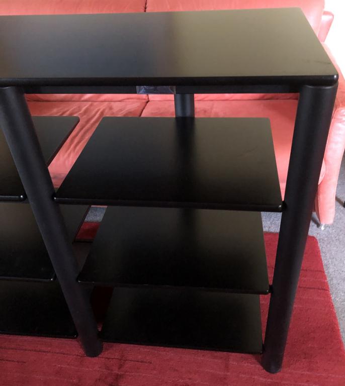 Die Kanten der Böden sind abgerundet. Die Oberseiten der Böden sind schwarz lackiert, die Unterseiten sind mattschwarz. Auf den Fotos sehen Sie alle Kanten der Böden und die beiden Seiten der Böden. Auf der Unterseite finden sich Spuren der Entkopplungsspikes. Die Qualität der Oberflächen ist auf den Fotos zu sehen, sie sehen natürlich nicht aus wie „frisch aus der Verpackung“, sind aber, wie ich finde, in gutem Zustand.