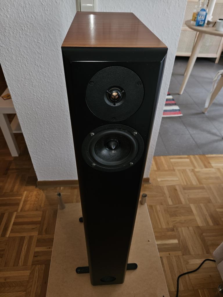3-Wege-Standlautsprecher mit seitlich montierten Tieftönern (Push-Push-Prinzip).