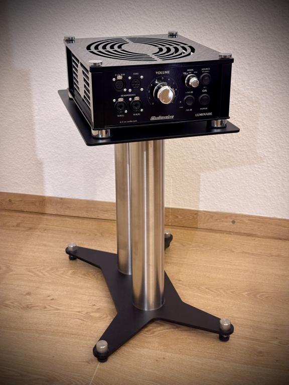 Ich verkaufe einen hervorragend erhaltenen, voll funktionsfähigen Audiovalve Luminare Kopfhörerverstärker, samt einem auf Maß hochwertig gebautem, auf Spikes stehenden Standfuß. Bei letzterem können die Standröhren für mehr Standfestigkeit und Dämpfung z.B. mit Quarzsand gefüllt werden.