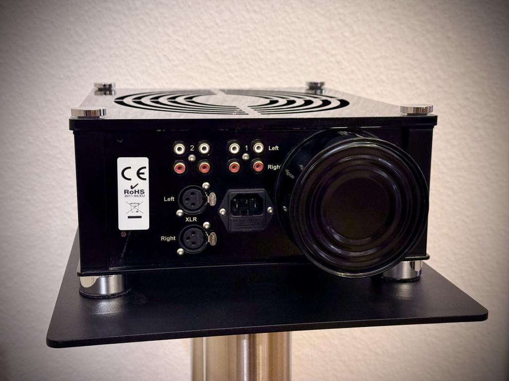 1 x XLR; drei Cincheingänge, davon einmal zum Durchschleifen; 1 x XLR; PreOut in Cinch; Kopfhörerausgänge, 2 x in Klinke 6,3 mm und 4-pol-XLR; 1 x für Stax; Gain anpassbar; Wahlschalter f. OTL- oder Übertragerbetrieb;