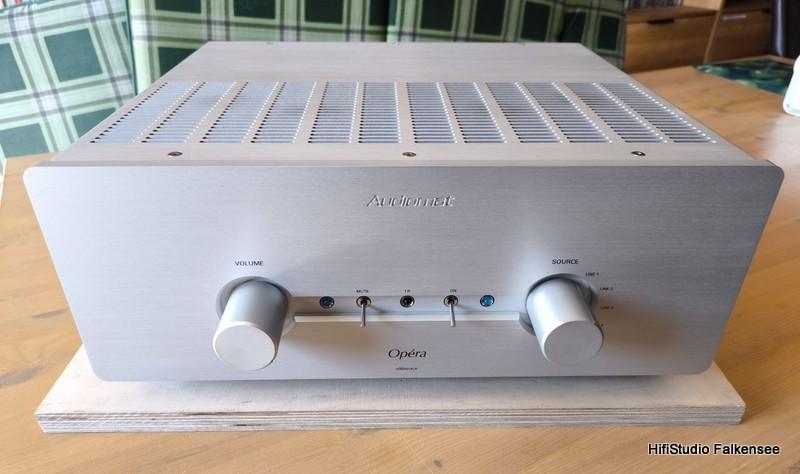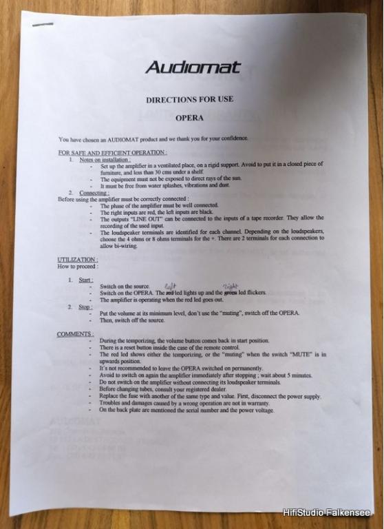 Der 2007 vorgestellte Opéra Référence verbindet die Erfahrungen und das Wissen, das Audiomat in der Entwicklung von Verstärkern seit 1987 gesammelt hat. Gegenüber dem ursprünglichen Opéra wurden neben dem Netzteil mit hochwertigen Kondensatoren von SIC SAFCO und SCR vor allem die Eingangsstufe komplett überarbeitet. Das Ergebnis ist ein beispiellos musikalischer Verstärker, der nahezu alle Lautsprecher problemlos an-treiben kann. Auch an kritischen Lasten verliert er nie seine klanglichen Grundeigenschaften: er bleibt immer schnell, flüssig, musikalisch und konturiert im Bass. Wer sich mit dem Opéra Référence beschäftigt, sollte vorab alle bisherigen Erfahrungen mit Röhrenverstärkern u¨ber Bord werfen und unvoreingenommen auf diesen Ausnahmeverstärker zugehen. Er hat nichts Schmeichlerisches und auch keine Härten, er reproduziert Musik einfach nur auf fesselnde Art und vermittelt dem Zuhörer, was die Musiker zum Ausdruck bringen wollen. Wenn Ihnen mit diesem Verstärker das Musik hören einmal keinen Spaß machen sollte oder Sie langweilt, dann können Sie sich absolut sicher sein, dass es an Ihnen und nicht am Opéra Référence liegt. Er fesselt mit jeder Art von Musik und an jedem guten Lautsprecher. Wie alle Geräte von Audiomat wird auch der Opéra référence sorgfältig von Hand hergestellt. Bei der Entwicklung wurde intensiv auf mögliche klangschädigende Mikrophonieeffekte geachtet, die mechanische Schwingungsableitung des Gehäuses erfolgt daher über 3 massive Messingkegel. Das klanglich beste Ergebnis liefert der Opéra référence auf einer Stellfläche, die nach musikalischen Gesichtspunkten ausgewählt ist. Im Inneren des Verstärkers werden für den Signaltransport ausschließlich hochwertige, geschirmte Leitungen eingesetzt. Alle Eingangsbuchsen sind Teflon isoliert und vergoldet, die soliden Lautsprecherklemmen nehmen alle Arten von Verbindungen sicher auf. Für die Bequemlichkeit hat der Opéra référence eine fernbedienbare Lautstärke, die über ein hochwertiges ALPS-Potentiometer geregelt wird und neben der normalen auch eine feine Regelung der Lautstärke erlaubt. Die Eingangswahl erfolgt klassisch über einen klanglich überlegenen mechanischen Schalter von Lucas. Stromfressende Standby-Schaltungen hat der Opéra Référence auch nicht, er wird nach dem Hörgenuss mit einem Kippschalter auf der Frontplatte komplett vom Netz getrennt.