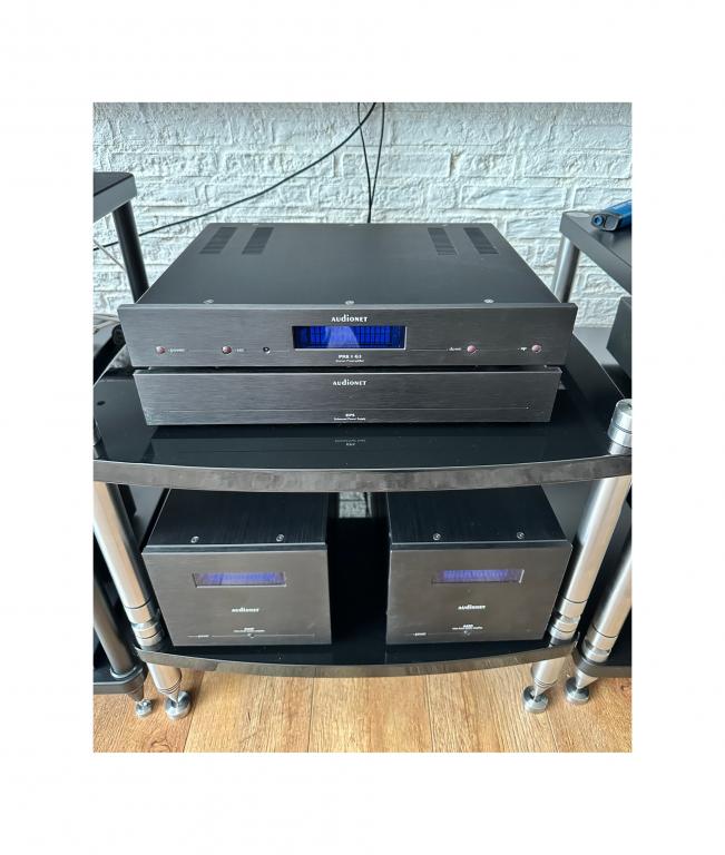 Audionet Pre 1 G3 + Remote control + Eps G2 linear source, in the original boxes! List price preamplifier and options: €9800 Technical Data Bandwidth: 0 – 3,000,000 Hz (-3 dB), DC-coupled THD + N: -110 dB @ 20 Hz to 20 kHz @ Vin=4.5 Vrms SNR: 120 dB @ 1kHz @ Vin, max Slew rate: 10 V/µsec Channel separation: channels: 100 dB @ 20 kHz Inputs: 108 dB @ 20 kHz Input voltage: max. 5 Vrms Input impedance: line 82 kOhm real XLR 15 kOhm real Output voltage: line max. 8 hrs XLR max. 16 Vrms Headphones max. 8 Vrms (max. gain 6 dB) Output impedance: line, XLR 22 Ohm real headphones 47 Ohm real Mains: 220...240 Volt / 50...60 Hz or 110...120 Volt / 50...60 Hz Power consumption: < 1 W stand by, max. 50 W Dimensions: width 430 mm height 700mm depth 310 mm Audionet AMP List price: €13,490 These are ultra hi-end amplifiers with a huge damping factor that can drive really difficult speakers. The sound is exactly as described in all the reviews: transparent, with a huge soundstage and a particularly precise bass. Very good matching with speakers Raidho, Tad, YG Acoustics, Borresen, Wilson Benesch, Vienna Acoustics, Bowers&Wilkins (for which Audionet engineers designed active crossovers from Bowers&Wilkins Nautilius!) Technical Data Output: 200 W into 8 ohms 350 W into 4 ohms 550 W into 2 ohms 750 W into 1 ohm Filtering capacity: 94,000 µF Frequency Response: 0 – 300,000 Hz (-3 dB) Damping Factor: > 1,800 @ 10 kHz > 10,000 @ 100 Hz Harmonic Spectrum: k2 typ. -117 dB for 25 Watts @ 4 ohms k3 type -140 dB for 25 Watts @ 4 ohms Intermodulation < -110 dB SMPTE 100 Hz: 20 kHz, 4 : 1, 50 W @ 4 ohms THD + N: < -105 dB at 1 kHz, 35 Watts @ 2 ohms between 20 Hz and 20 kHz SNR: > 122 dB Input Impedance: RCA: 37 kOhm, 220 pF XLR: 3 kOhm, 170 pF Power consumption: max. 1,000W Mains connection: 120 or 230 V, 50...60 Hz Dimensions: width 215 mm height 190 mm depth 500 mm Weight: 22 kg/mono block