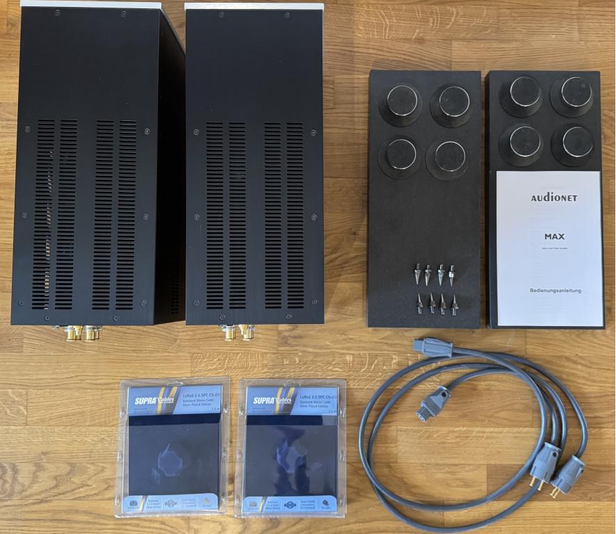 Im Kaufpreis enthalten sind zwei hochwertige 1,5 m lange Netzkabel der Firma „Supra Cables“, Typ „Silver Plated Edition“ sowie eigens gefertigte Baseplates aus MDF und Furnier mit Spikes oder wahlweise Gummi-Absorbern. Sofern Sie das vorgenannte Zubehör nicht erwerben möchten, können Sie gedanklich 350 Euro vom angesetzten Preis abziehen.