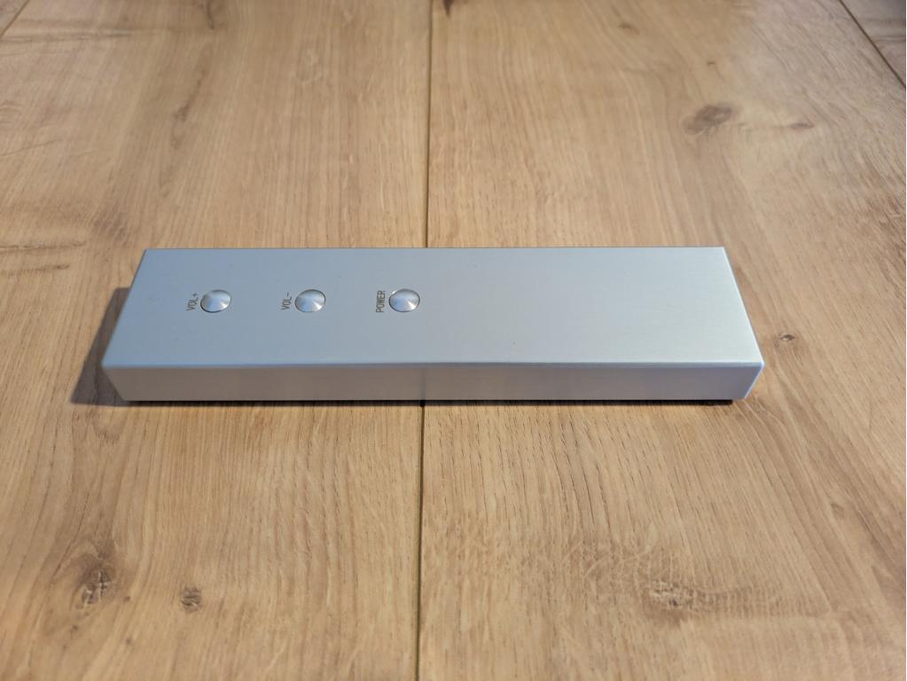 Massive Aluminium-Fernbedienung: Aus dem Vollen gefräst, haptisch ein Genuss und passend zum massiven Design des Verstärkers.