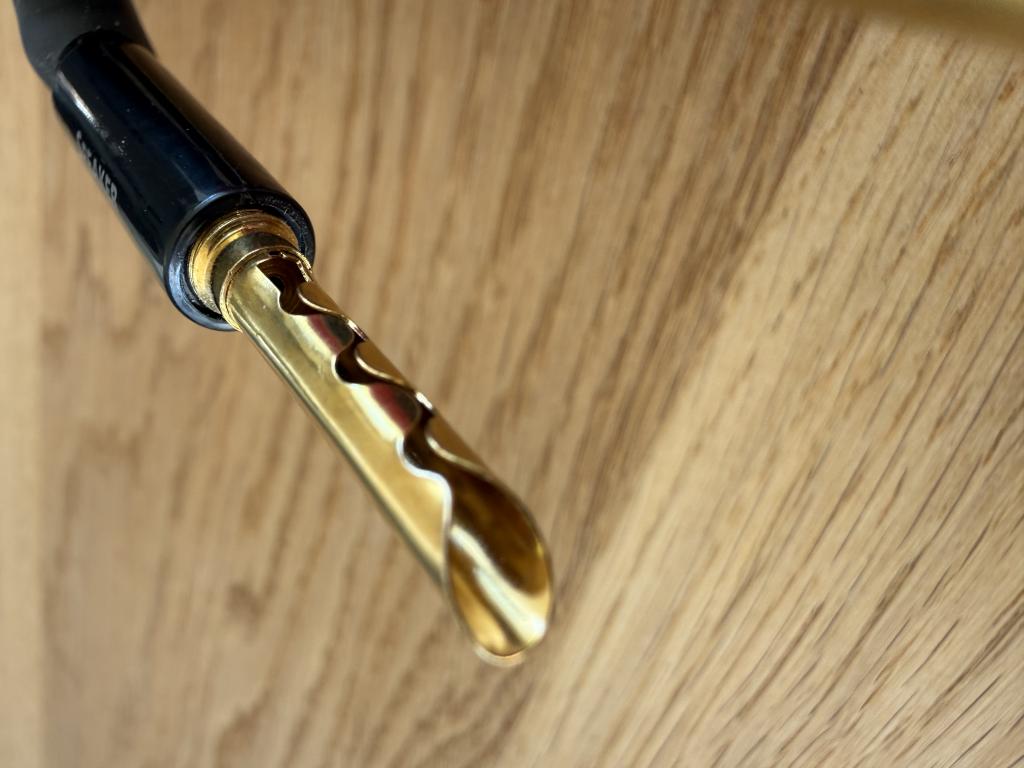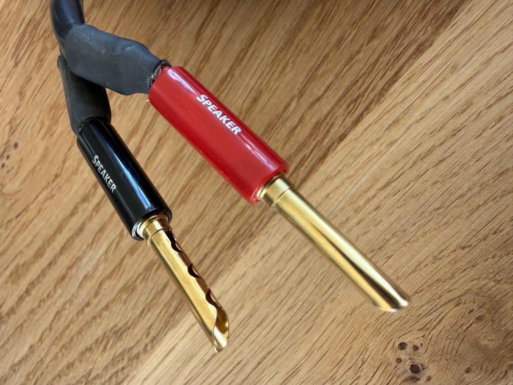 Audioquest Rocket 11 Lautsprecher Kabel 2x2m mit SureGrip 100 BFA Steckern. Wurden durch HiFi Händler seinerzeit aus Meterware und Steckern konfektioniert. Die Aufschrift auf den Steckern wurde falsch konfektioniert, so dass an einem Kabel nur Speaker und am anderen nur Amp auftaucht. Das hat aber keine Funktion Einschränkung, da die Stecker absolut identisch sind und nur die Aufschrift eine Hilfe beim Anschluss sein soll. Am Kabel befindet sich aber auch ein Pfeil für die Richtung Amp to Speaker.