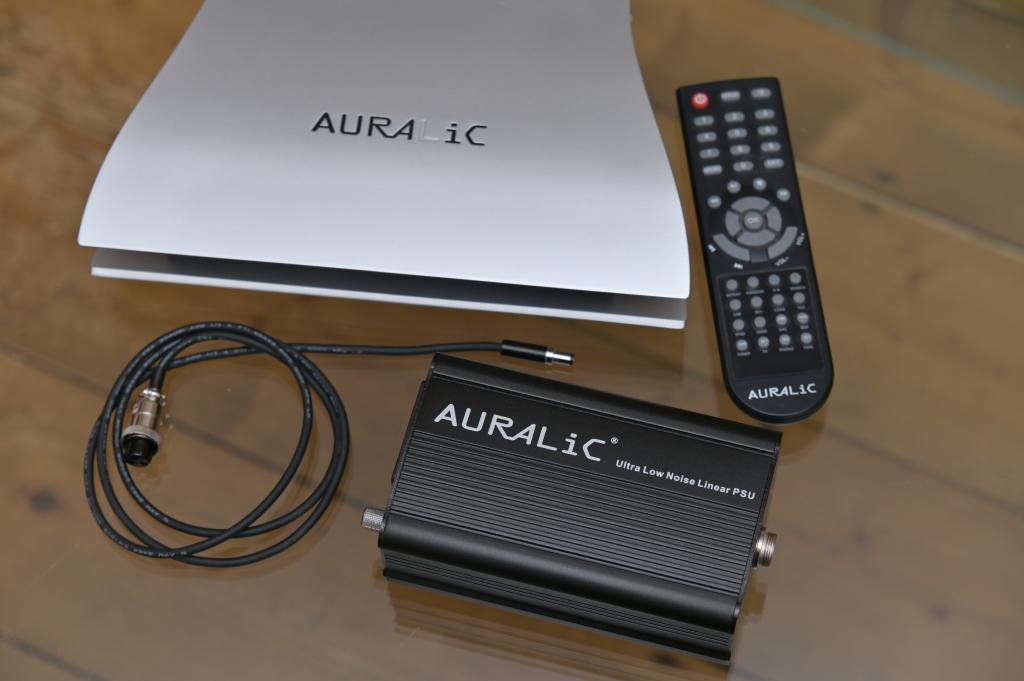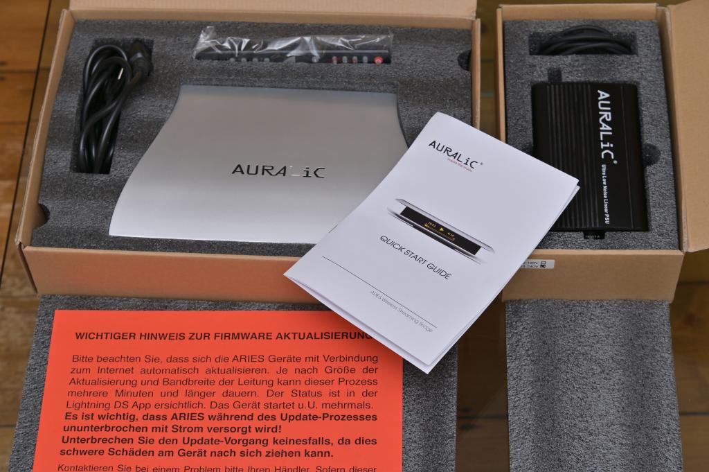 Zum Verkaufspaket gehören: Auralic Aries Femto Linear Netzteil (mit Kabel) Fernbedienung Stromkabel Quick-Start-Guide