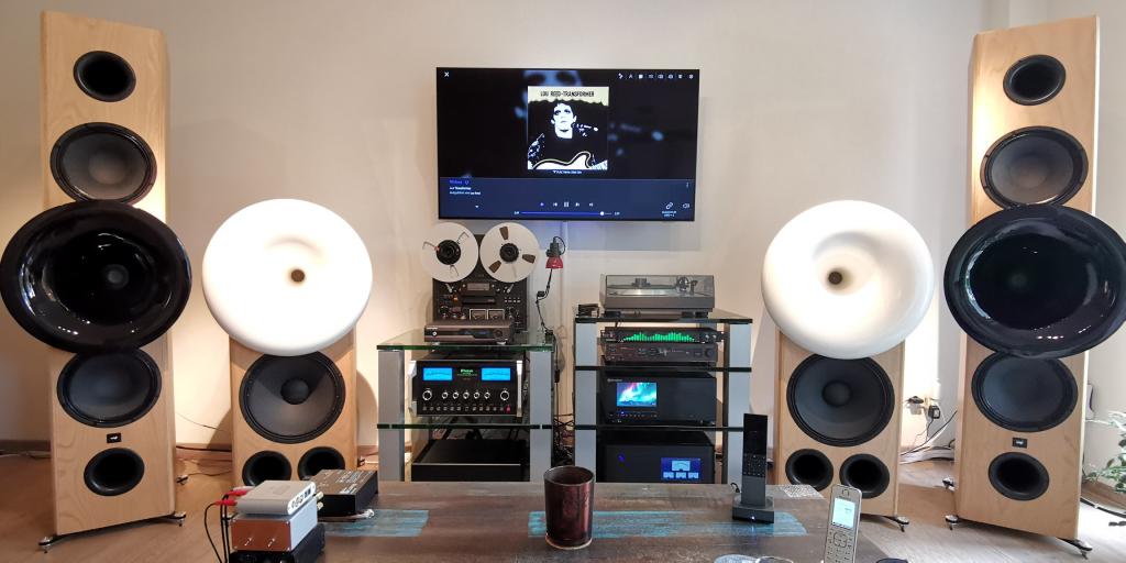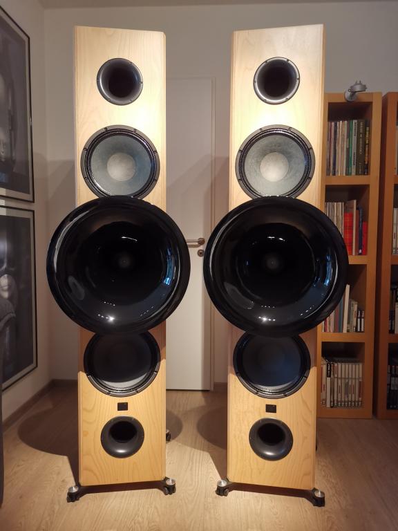 Die Kugelwellenhörner bestehen aus einem sehr resonanzarmen Kunststoff- Glasfasergemisch, klingen NICHT hart, sondern sehr dynamisch und klangfarbenreich bei extrem feiner Auflösung!