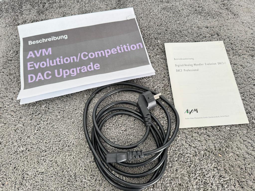 Im Lieferumfang enthalten ist: AVM Evolution DAC3, Netzkabel, Anleitung und eine neutrale Verpackung.