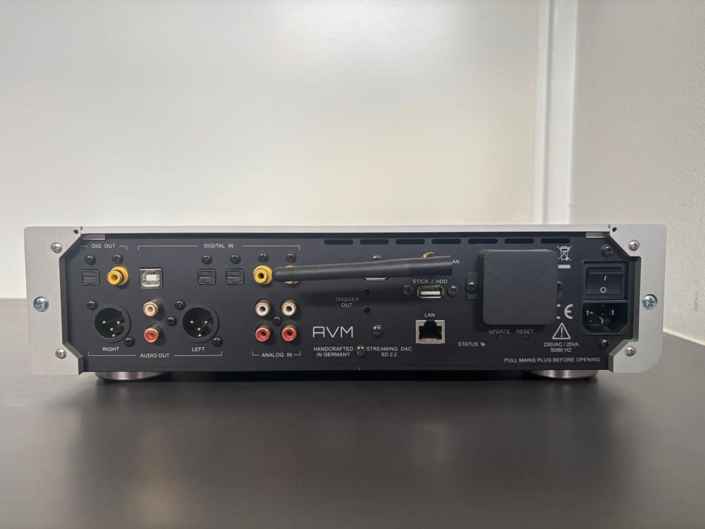 synchronous USB input (up to 192 kHz/24-bit), WLAN & LAN for network streaming of formats (FLAC, and WAV) a DAC with upsampling to 192 kHz, and a built-in discrete headphone amplifier. It supports UPnP, DLNA, and internet radio (vTuner/Airable), offers adjustable input sensitivity, parametric loudness with bypass, and can be controlled via the AVM RC S App or an optional RC9 remote