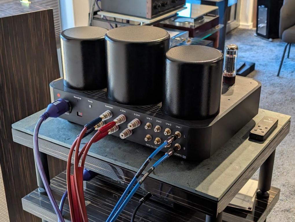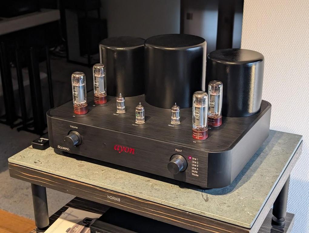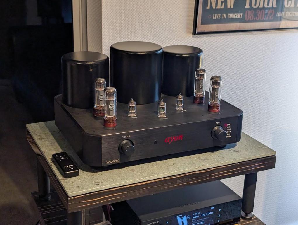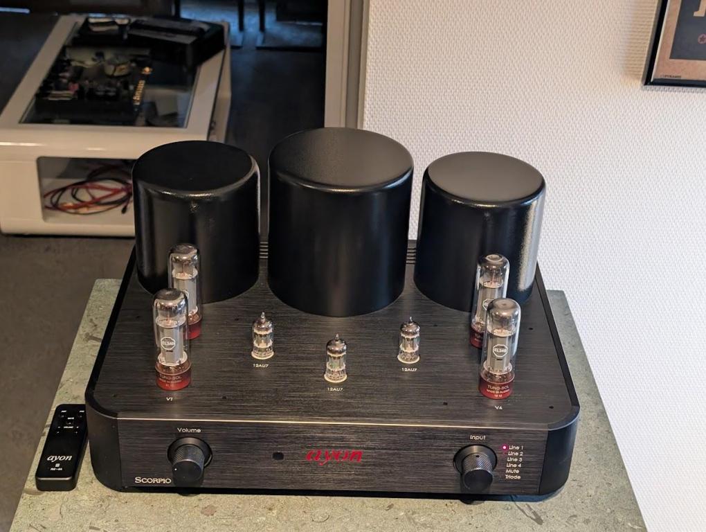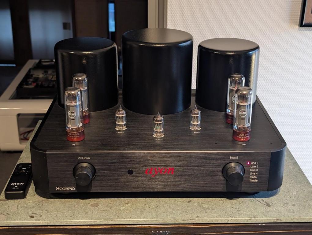 Ayon Scorpio in Top Zustand aus Erster Hand mit OVP, Fernbedienung und allem Zubehör. Der Verstärker ist von 2020. Im Kundenauftrag. Mit EL 34 Röhren, kann auch mit KT 88 betrieben werden.