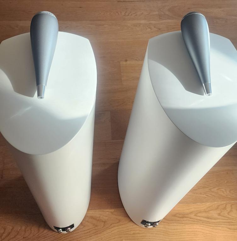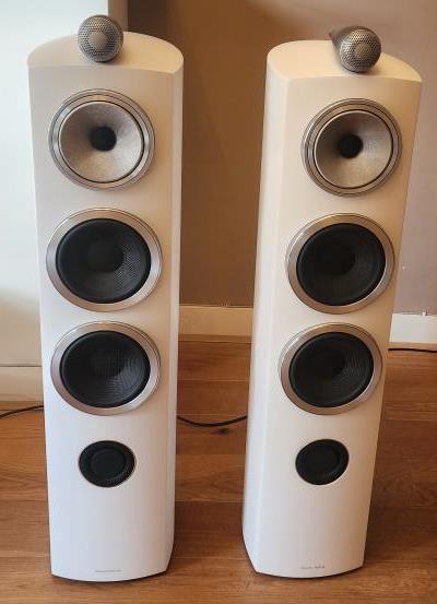 Bowers & Wilkins (B&W) 804 D3 in Satin Weiss, Top Zustand mit Abdeckungen, Gummiflüssen und originalen Verpackungen. Mitteltöner silberne Membranen sind leicht gelblich verfärbt, hat aber keinen Einfluss auf Klang und Funktion (wenn diese Verfärbung nicht gefallt kann ich durch Fachgeschäft beide Mitteltöner gegen Aufpreis von 500 Franken ersetzen lassen). Gekauft in 2018 bei B&W Fachhandler in der Schweiz. NP war SFr. 9500.-
