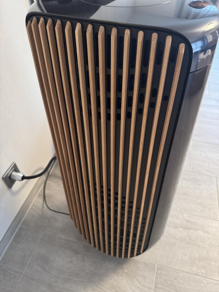 Das Aluminium ist in Black Anthrazite, die Front in Stoff in der Farbe light grey by Kvadrat und die Seitenteile sind in Light Oak.