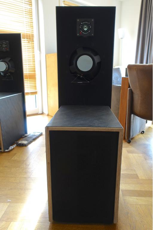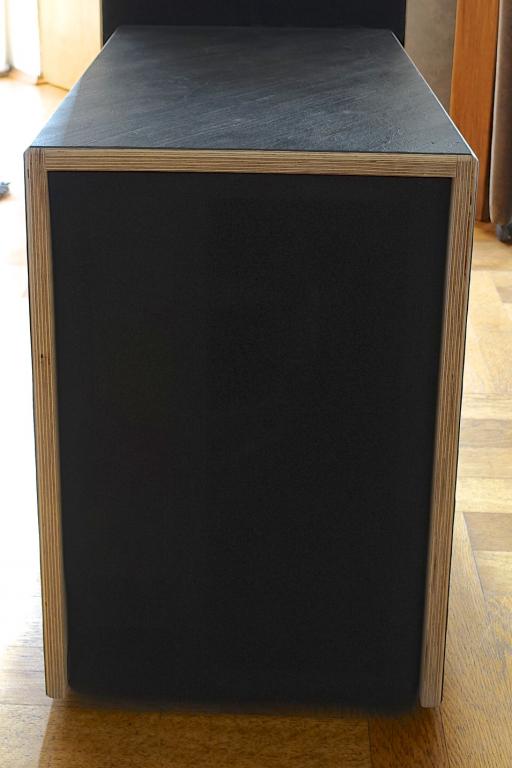 ca. 4,5 Jahre alt, Schieferfurnier, und extra dicke Schallwand aus Multiplex, woraus die etwas größere Tiefe von 62 zu 60 cm (Original) resultiert.