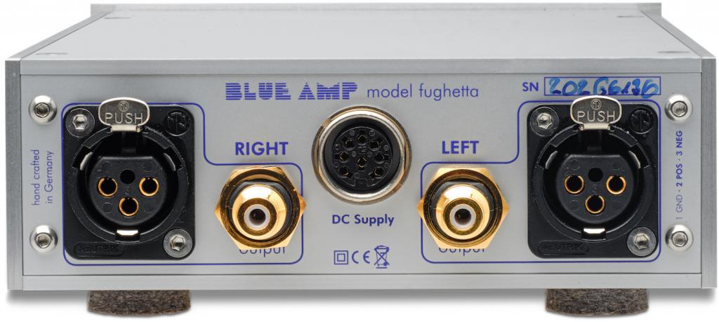 Auch das model fughetta arbeitet – wie alle Blue-Amp-Phono-Vorverstärker – mit einer voll symmetrischen Schaltung, die ohne Massebezug auskommt. Deshalb besitzen die Phonostufen von Blue Amp auch keine Massebuchse (mehr), und die Phonokabel benötigen keine Abschirmung. Auch Längen von mehreren Metern sind kein Problem, ohne jegliche Brummstörungen.