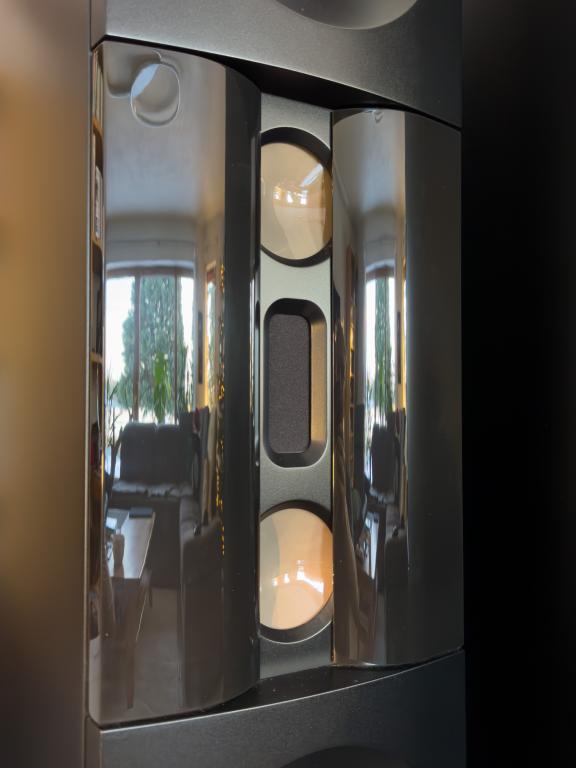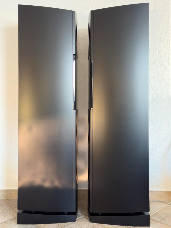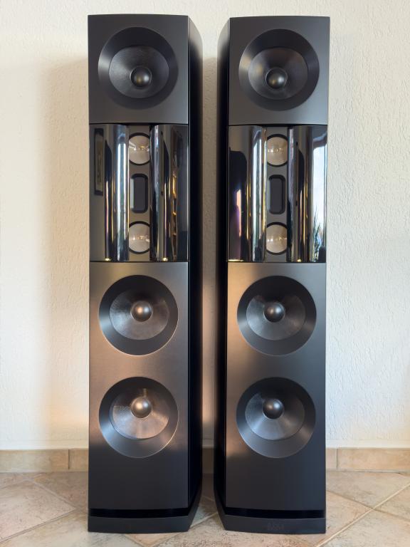 Farbe: seidenmatt glänzend (Iron Cast Black), Linse Mittel-/Hochton und Oberseite in Klavierlack
