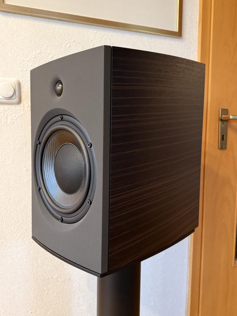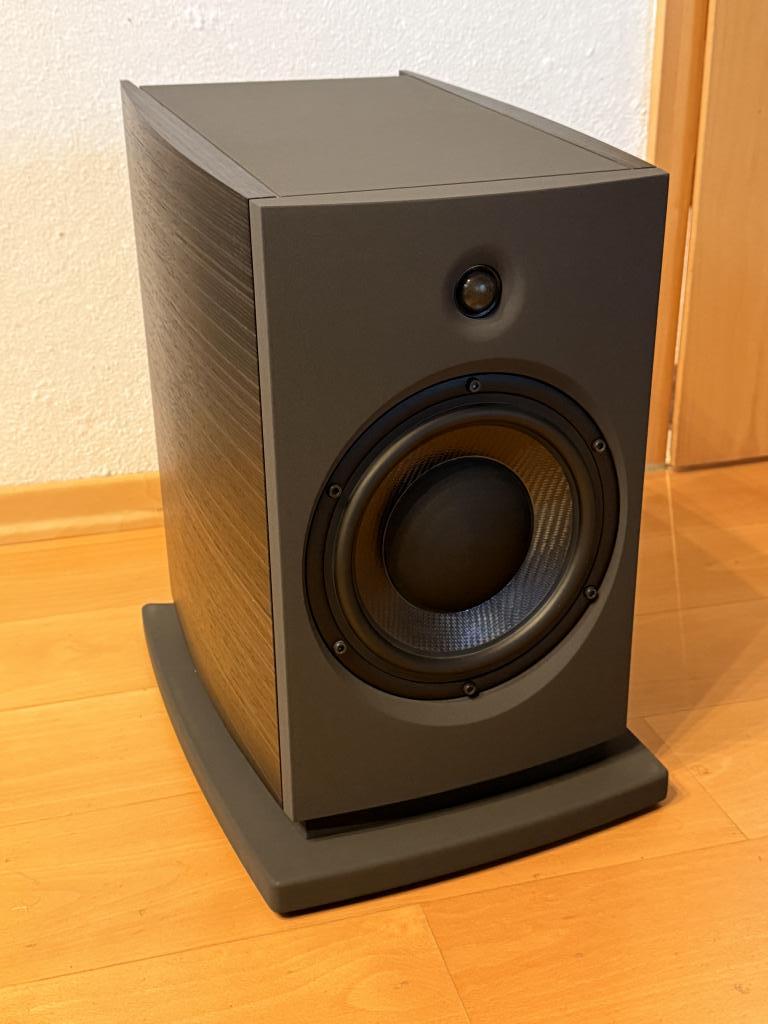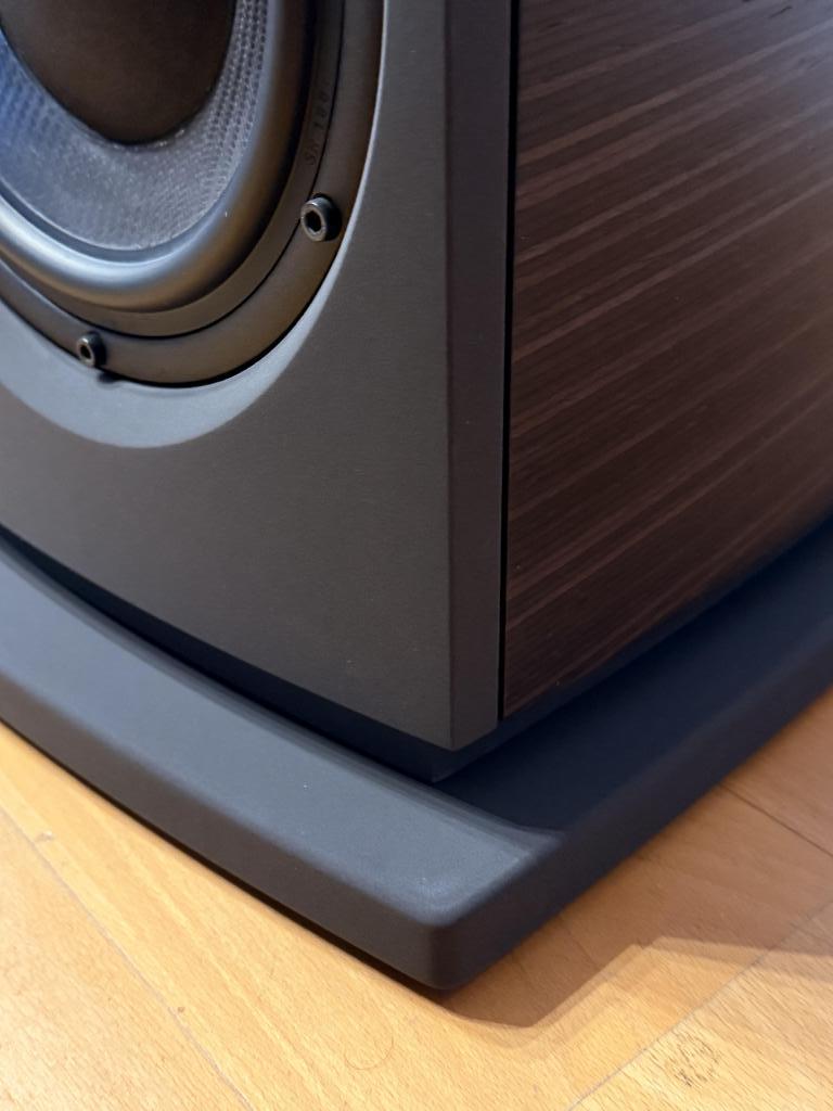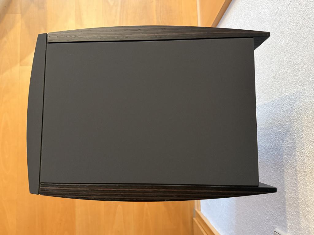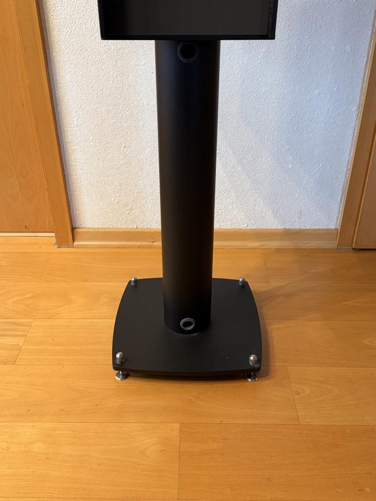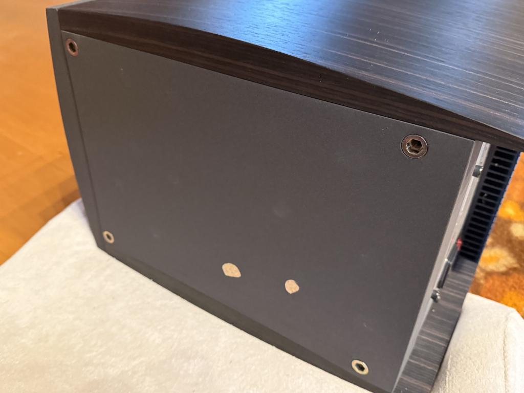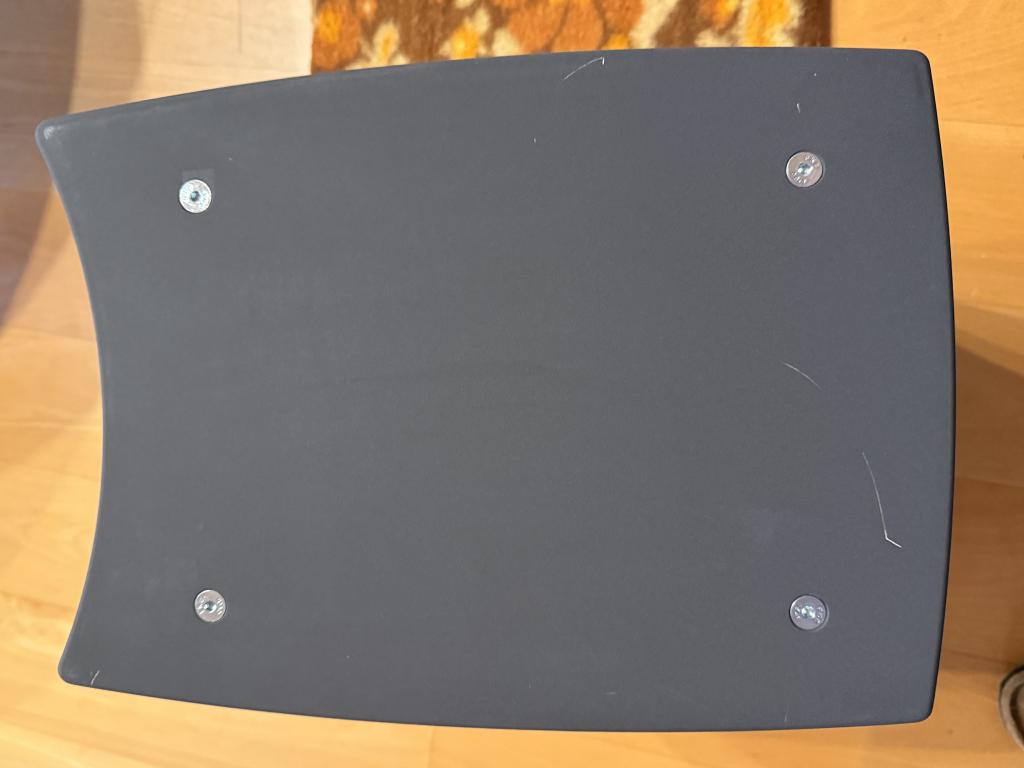 - Am Unterboden einer Box ist leider beim Entfernen vom Ständer (BluTack-Klebeverbindung) der Lack etwas abgeplatzt (s.Foto) ist aber im Regelbetrieb nicht sichtbar da Fläche vom Fuß bzw. Ständer abgedeckt wird.