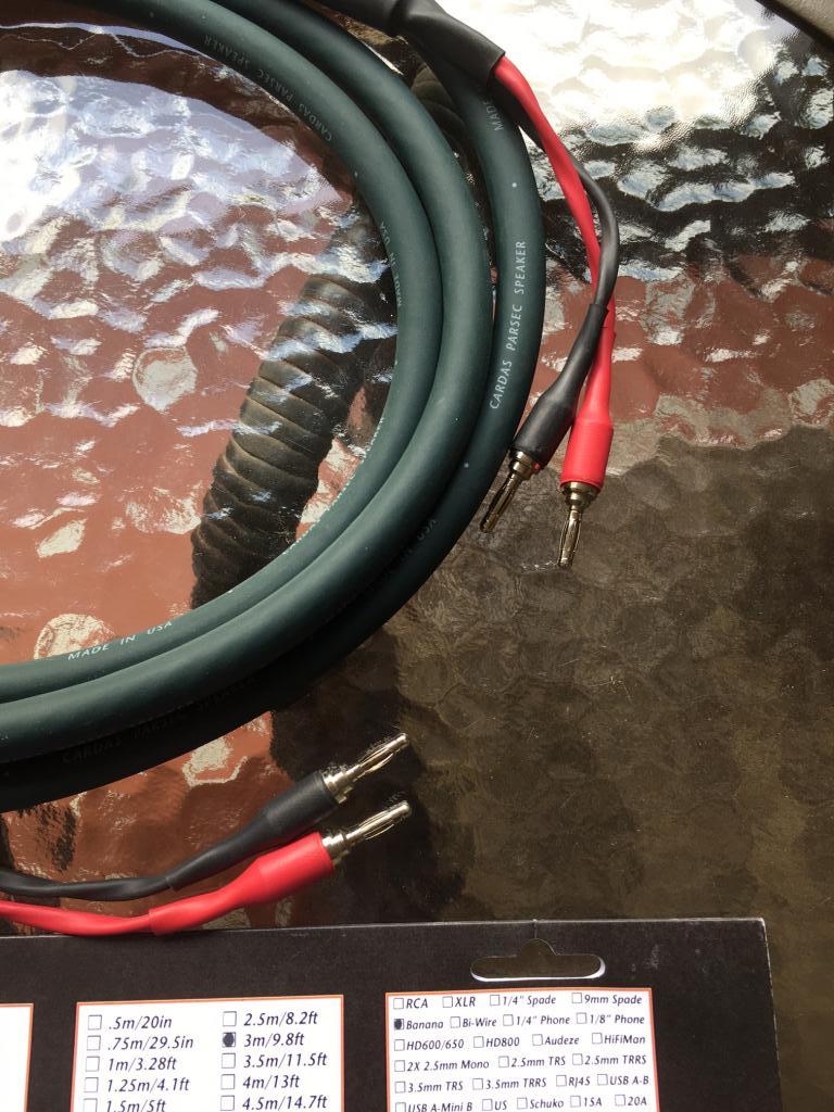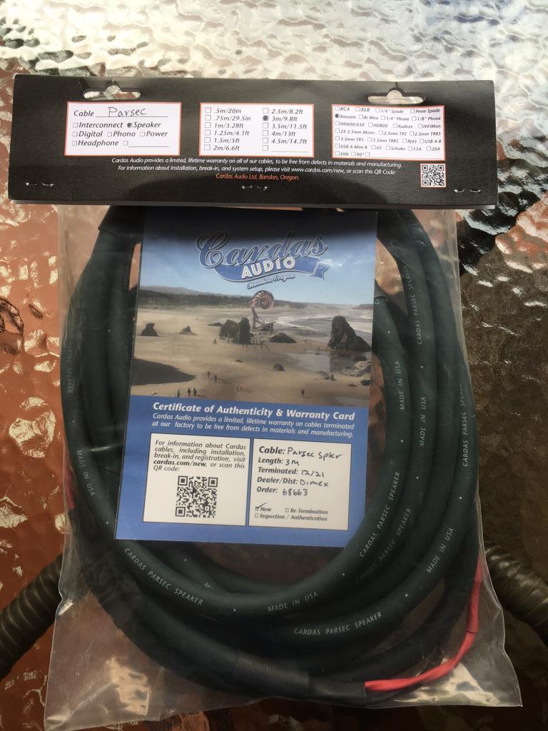 I am selling a pair of Cardas Parsec speaker cables, three metres long. Lightly used, very good condition. Original packaging and documentation.
