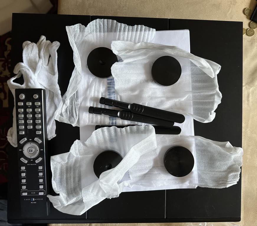 control, 3 antennae, feet/spikes, IEC cable for a North American duplex outlet, and the Quick Start guide. Packaged in manufacturer s original box (double-boxed). NOTE: The unit is configured for Europe. I made myself the swap. However, it can be user-adjusted by opening the top and relocating the jumper to enable 117V or tlet the US purchasers do it by themselves (Procesudre send by CARY AUDIO service support.