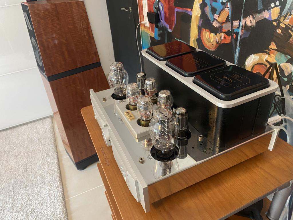 Der Verstärker kommt frisch aus einer der renommiertesten deutschen Werkstätten für Röhrenverstärker. Dort wurde eine Revision durchgeführt und alle! röhren wurden gegen neue ausgetauscht. Die 300 B selbst ist eine Western Elektrik und wurde 50 Stunden eingebrannt.