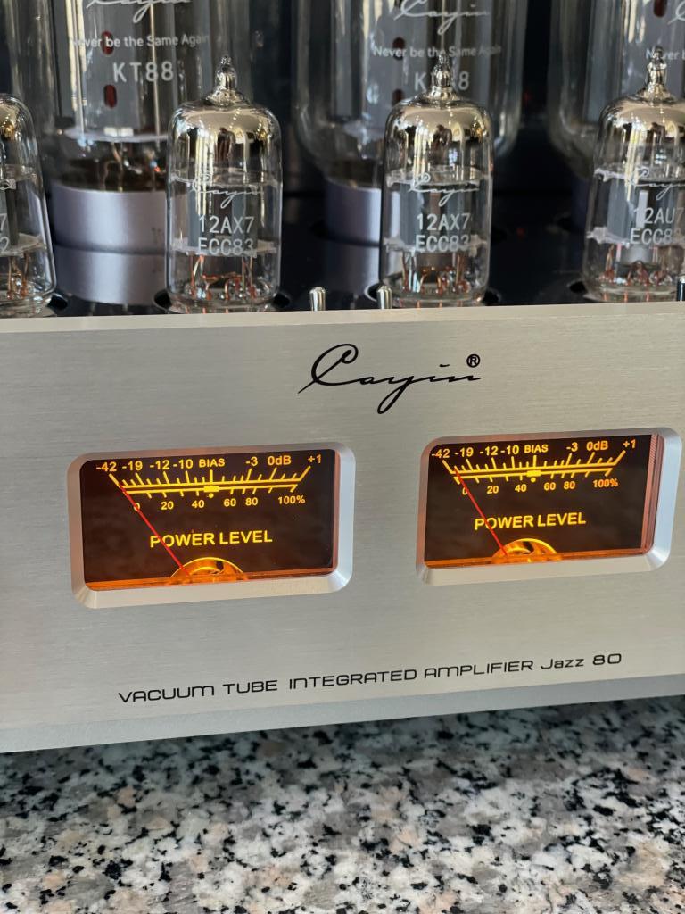 Wie von Cayin gewohnt, ist auch der Jazz 80 fein spezialisierter Allrounder. Bedeutet: Er ist so vorbereitet, dass er möglichst jeden Lautsprecher zur Höchstleistung antreibt. Die aktuelle Ausgangsleistung wird dabei ganz klassisch über zwei orangefarbig hinterleuchtete VU-Meter angezeigt. Egal welcher Schallwandler auch angeschlossen ist, der Nutzer erlebt immer die gleiche, neutrale und präzise Cayin-Klangsignatur. Um das auch in jedem Raum und mit jedem Lautsprecher zu gewährleisten ist der Jazz 80 so abgestimmt, dass er sowohl Mitspieler mit einer Impedanz von 4 Ohm wie 8 Ohm mit ausreichend Leistung versorgt. Der Cayin verfügt dafür auf seiner Rückseite über massive und vergoldete Schraubklemmen, die sowohl Kabelschuhe, Bananas wie auch unkonfektionierte Kabel aufnehmen. Über drei analoge Eingänge finden Musiksignale den Weg in den Jazz 80. Ein frontseitiger 6,5-Millimeter-Ausgang dient der Audio-Übertragung an einen Kopfhörer.