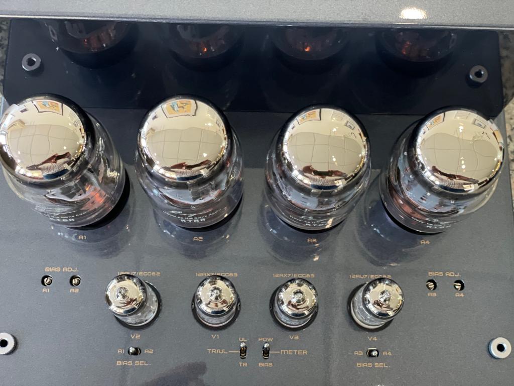Gleich nebenan gibt es drei weitere Kippschalter, einer links und zwei rechts. Sie helfen bei der Kontrolle der korrekten Bias-Einstellung. Dieser lässt sich individuell für jede Ausgangsröhre per Trimm-Potentiometer anpassen. Die drei besagten Hebel dienen anschließend der Überprüfung der vorgenommenen Änderungen. Der mittige Kippschalter macht aus dem linken VU-Meter das Kontrollelement zur Bias-Einstellung. Über den linken Hebel (A1/A2) werden die Röhren für den linken Kanal und über den rechten (A3/A4) die des rechten Kanals kontrolliert. All das dient der perfekten Ansteuerung jeder Röhre und zugleich dem sauberen Abgleich aller Kanäle.