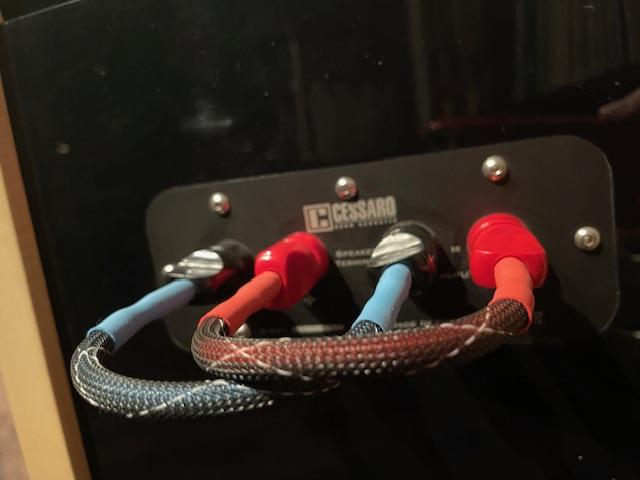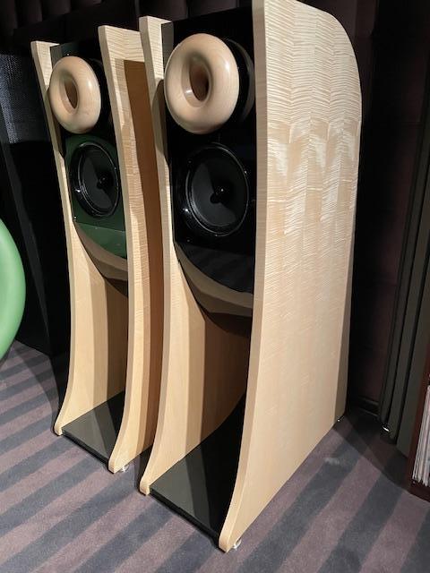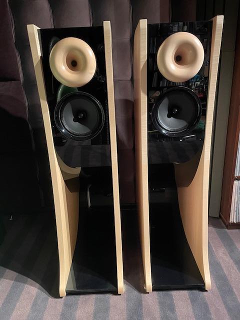 I'm selling lightly used Cessaro Chopin speakers with TEAD drivers in a Bashorn design with a high efficiency of 109 dB. These speakers are in perfect condition and were used for presentations in the distributor's studio. They haven't been at any trade shows and have never been used outside of the studio for listening. They are absolutely like new, with no signs of wear. They offer a wonderful sound experience and beautiful color. More details are available online. They come with their original cases measuring 158cm high x 91cm deep x 52cm wide.
