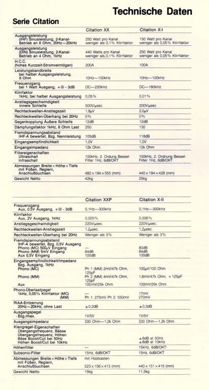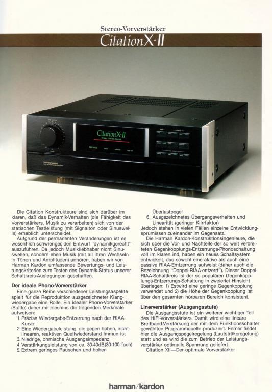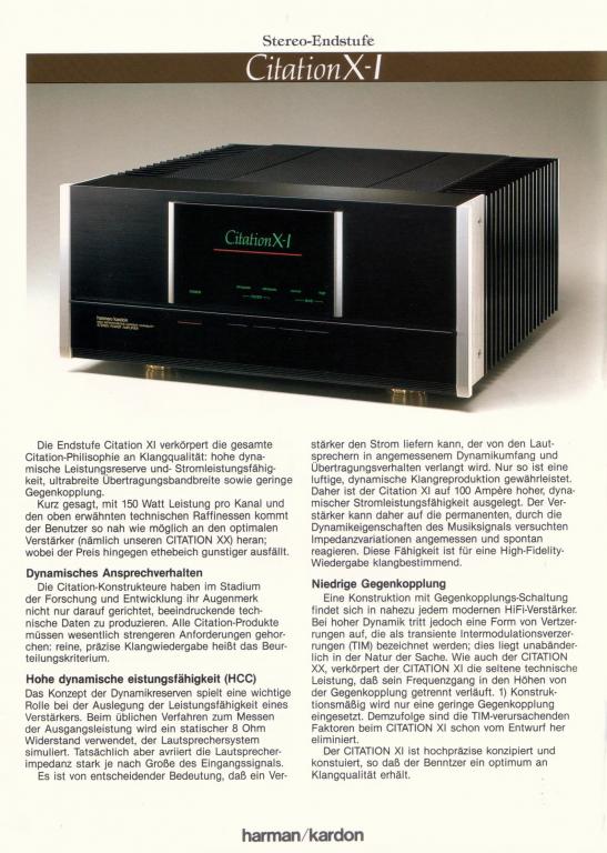 Legendäre Harman Kardon Citation X1 + X2 Vor- und Endverstärker, mit orig. Bedienungsanleitung. Seriennr. X1: 01446, X2: 01410. Damaliger Neupreis circa 10.000,-€. Entwickelt v. Prof.Dr. Matti Otala. Sehr selten. Der größere Bruder Citation XX u. XXP ist noch seltener (NP 20.000,-€). An Material wurde nicht gespart und nur das Beste eingebaut, im Gegensatz zu heutigen Produkten. Ersbesitzer, gekauft v. Hifi im Hinterhof. Zustand sehr gut, keine Dellen und Kratzer. Zusammen VB 3300,-€. X1 Endverstärker 1900,-€, X2 Vorverstärker 1600,-€. Sinusleistung 8 Ohm: 150 Watt, 4 Ohm 250 Watt, 0,05% Klirrfaktor, 25 KG. Bestandteil: Endstufe X1+Vorstufe X2 inkl. Netzkabel, 2xBedienungsanleitung (engl.), damalige Rg.