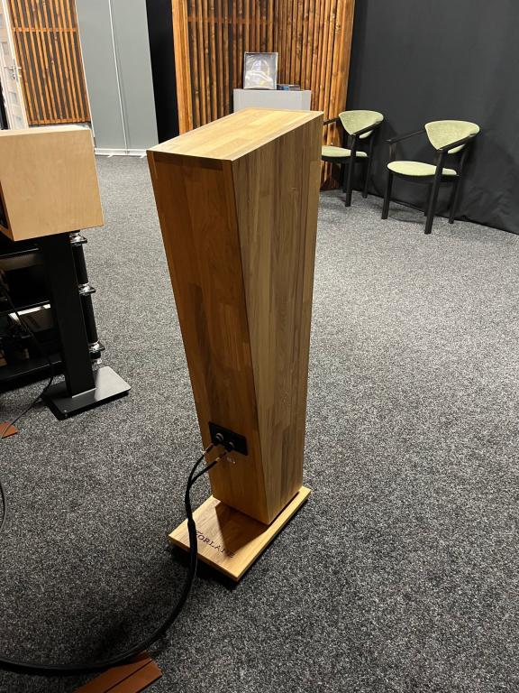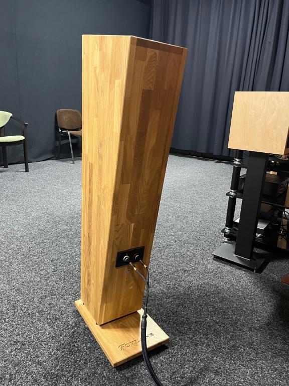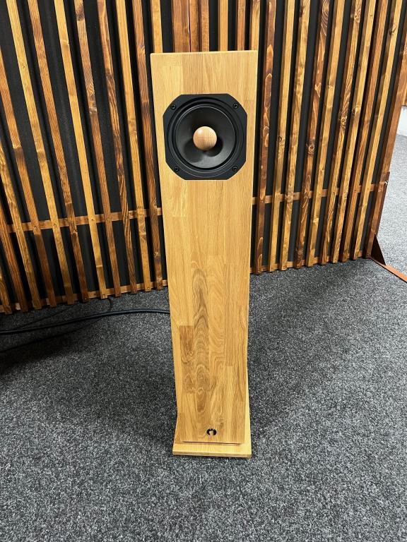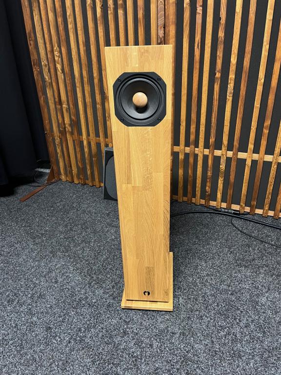 A Closer Acoustics distributed resonance cabinet - house specialty - made of solid oak planks with internals from quality Baltic birch ply. No damping materials at all. The complicated internal construction containing carefully designed channels ensures the enclosure stiffness and that the standing waves are virtually eliminated what results in a very clean and fast bass response. No need for using any damping materials behind the drivers preserves the liveliness of the drivers especially in the midrange.